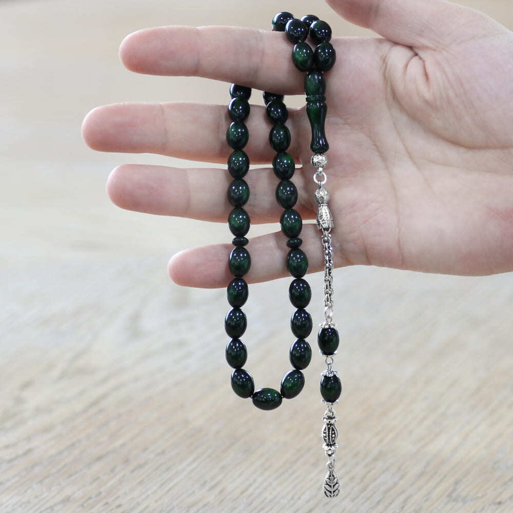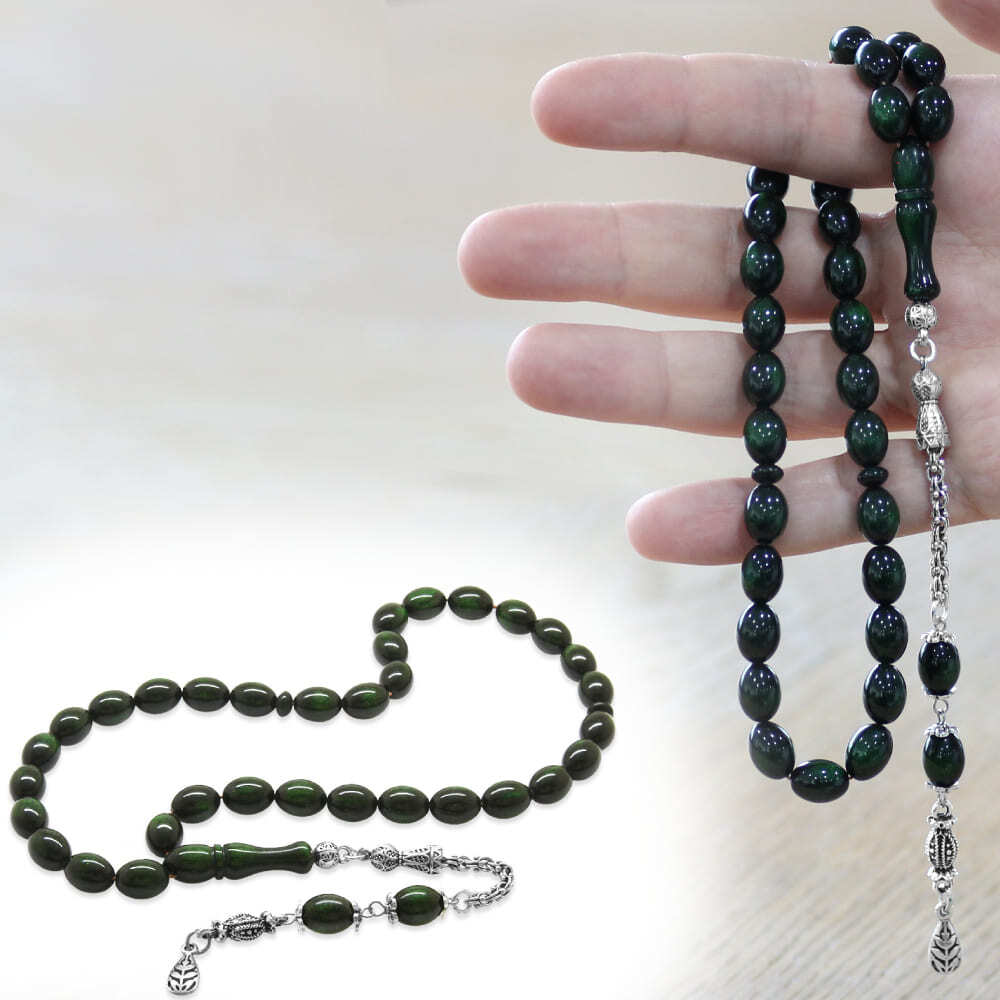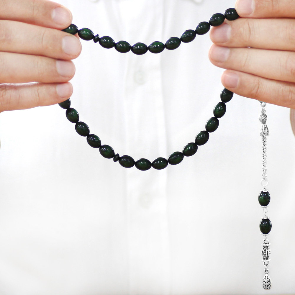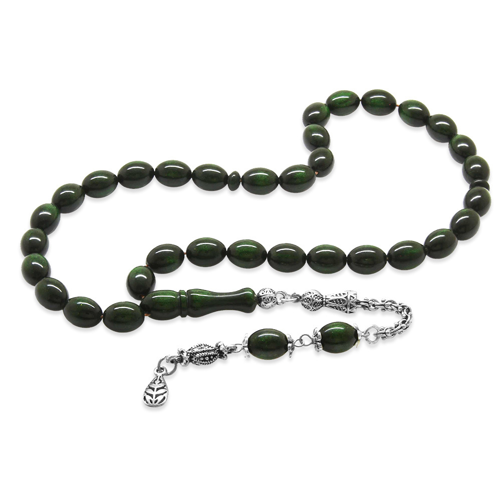 Yeni Döküm Katalin Tesbih - Kararmaz Metal Püsküllü - Sedefli Yeşil Renk - Arpa Kesim