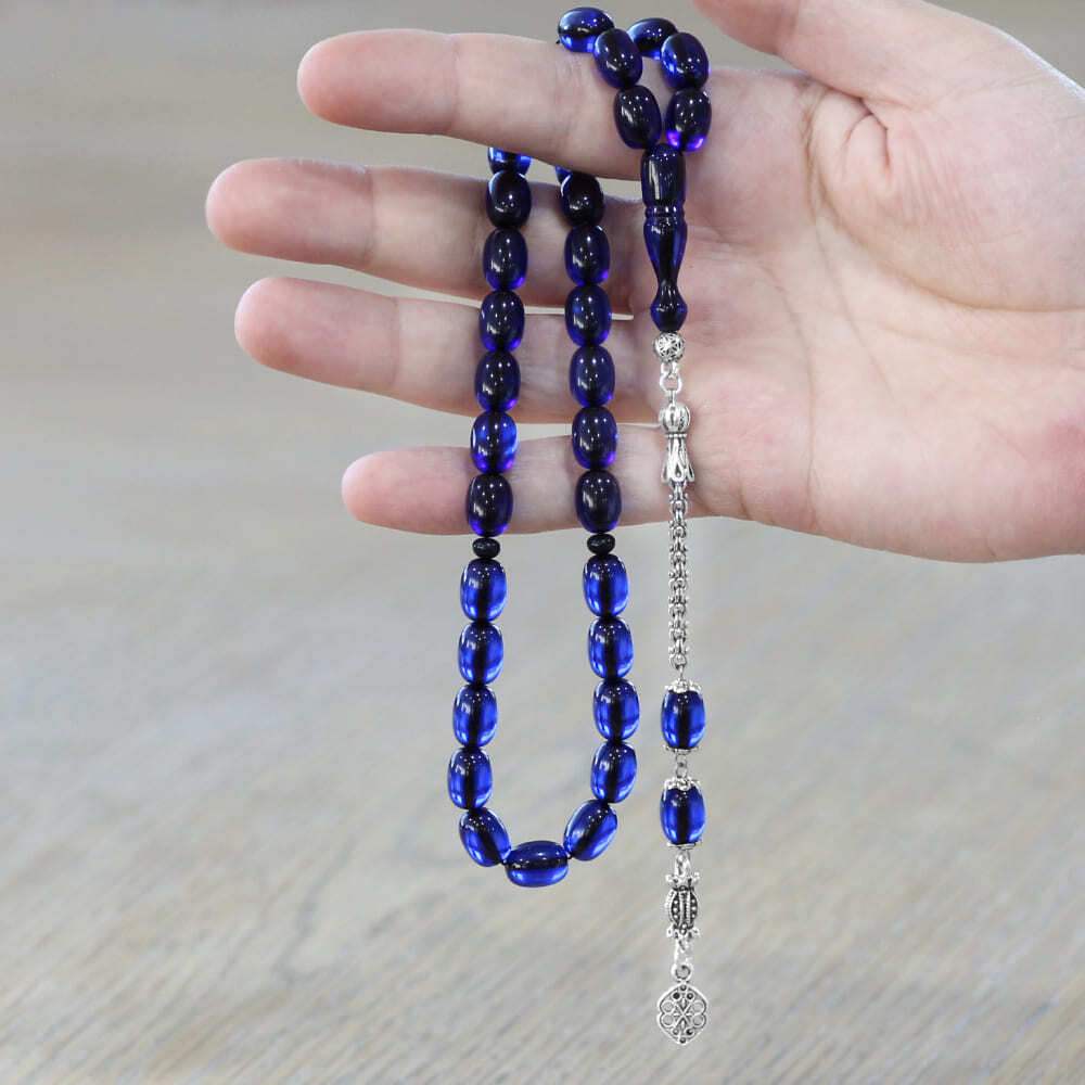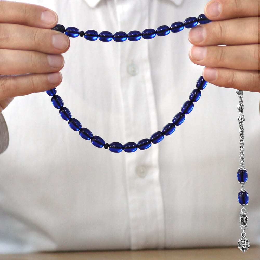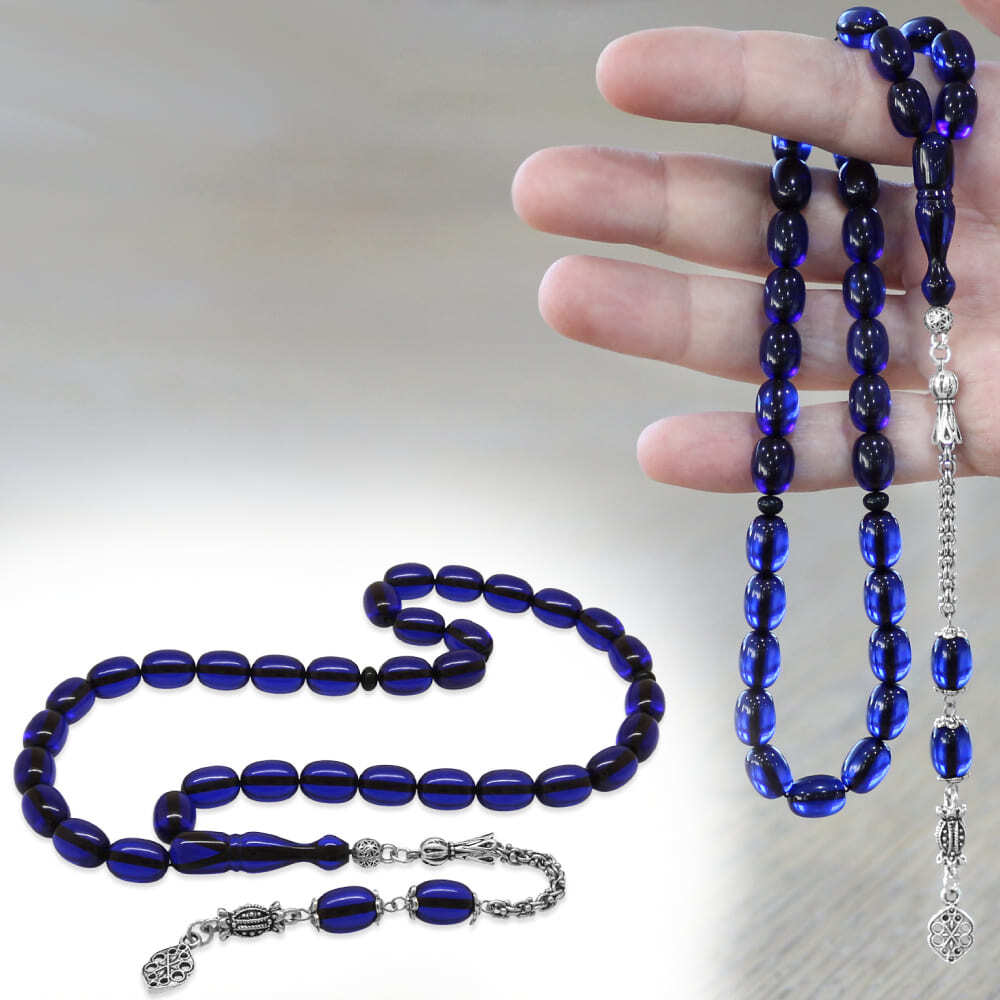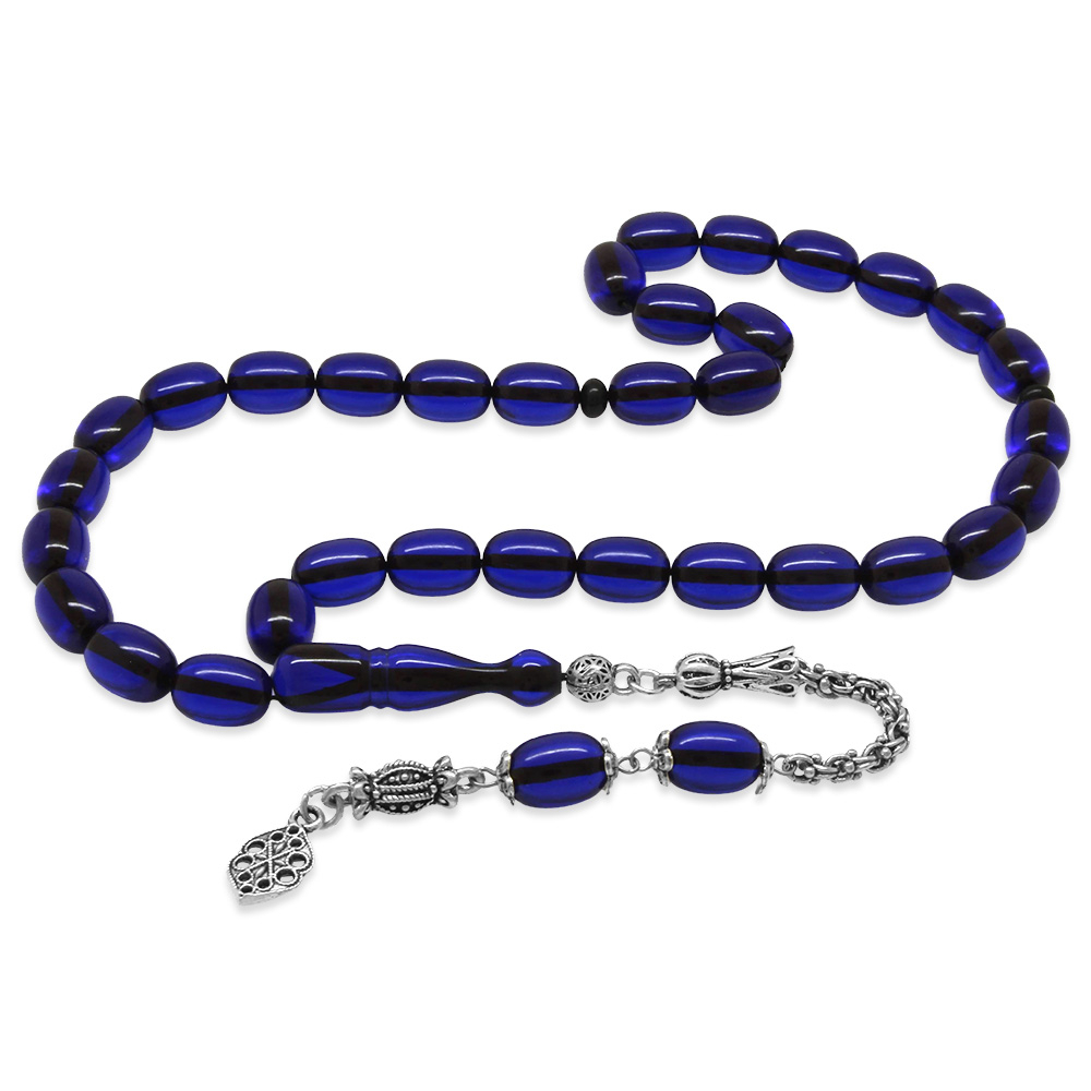 Yeni Döküm Katalin Tesbih - Şeffaf İp Yolu - Kararmaz Metal Püsküllü - Lacivert Renk - Kapsül Kesim