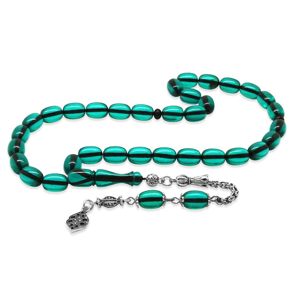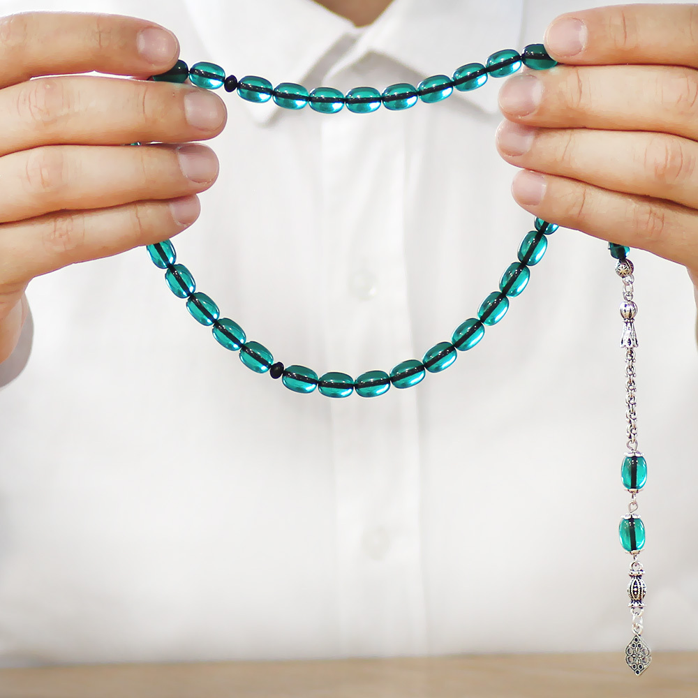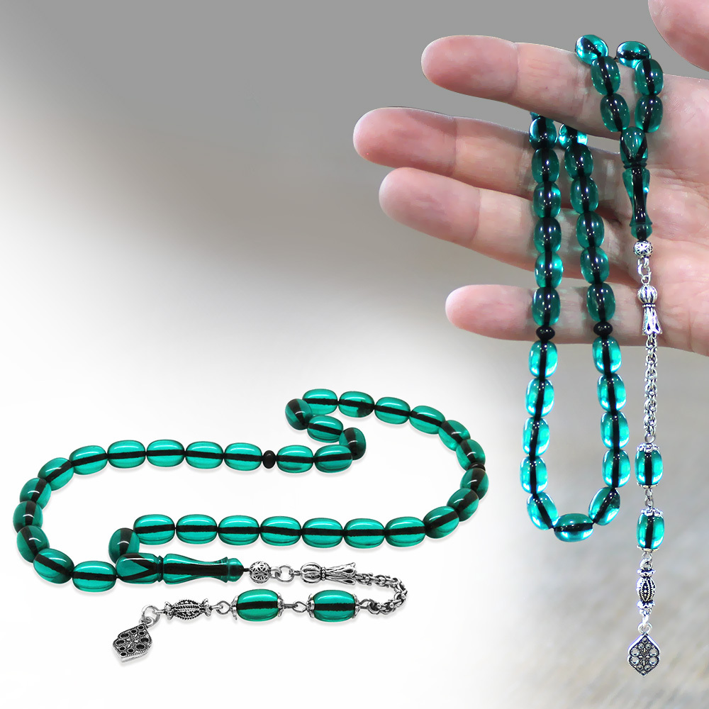Yeni Döküm Katalin Tesbih - Şeffaf İp Yolu - Kararmaz Metal Püsküllü - Su Yeşili Renk - Kapsül Kesim