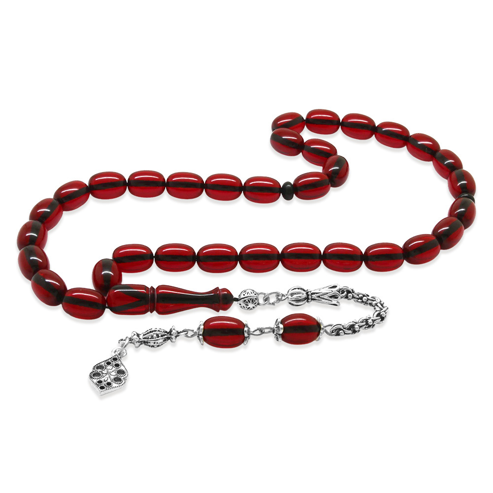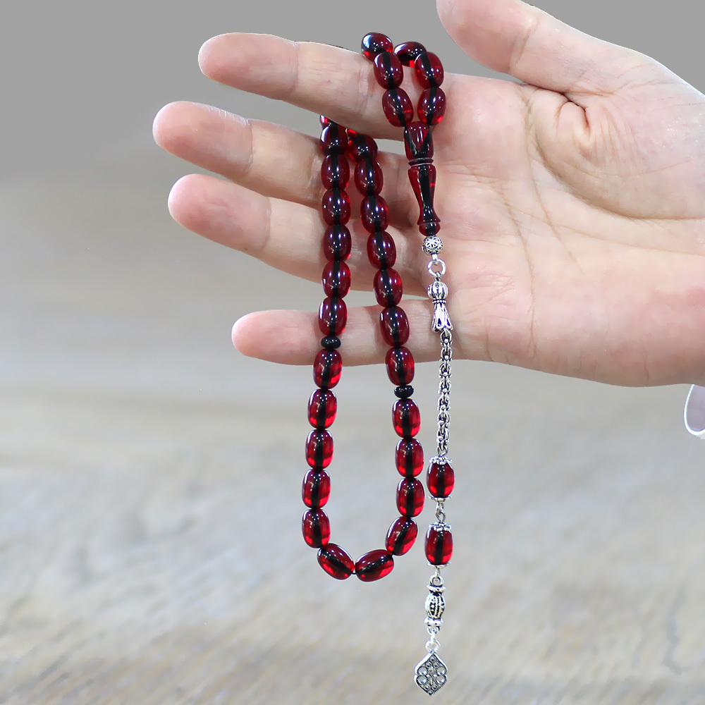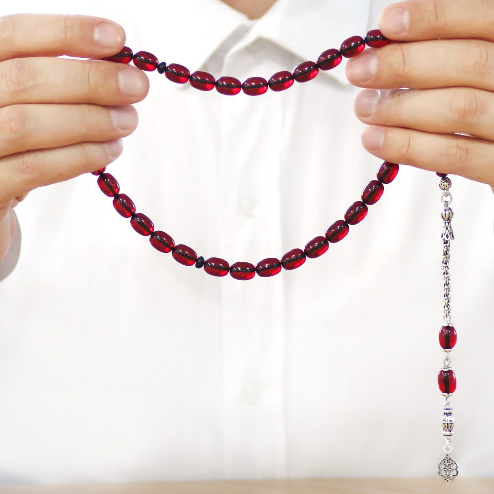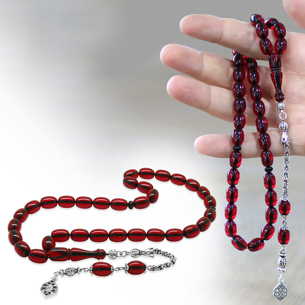 Yeni Döküm Katalin Tesbih - Şeffaf İp Yolu - Metal Püsküllü - Koyu Kırmızı Renk - Kapsül Kesim