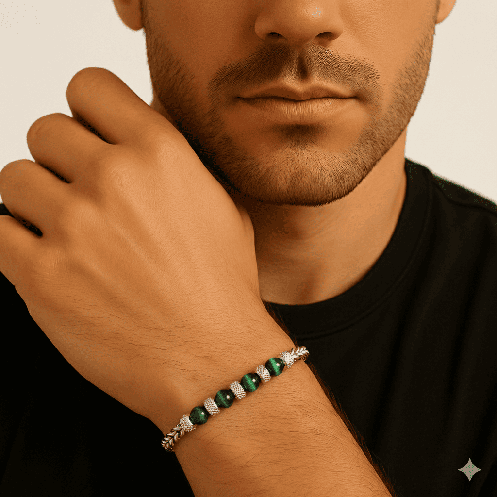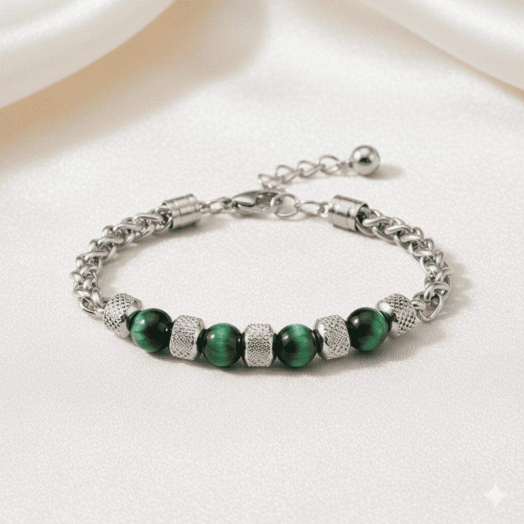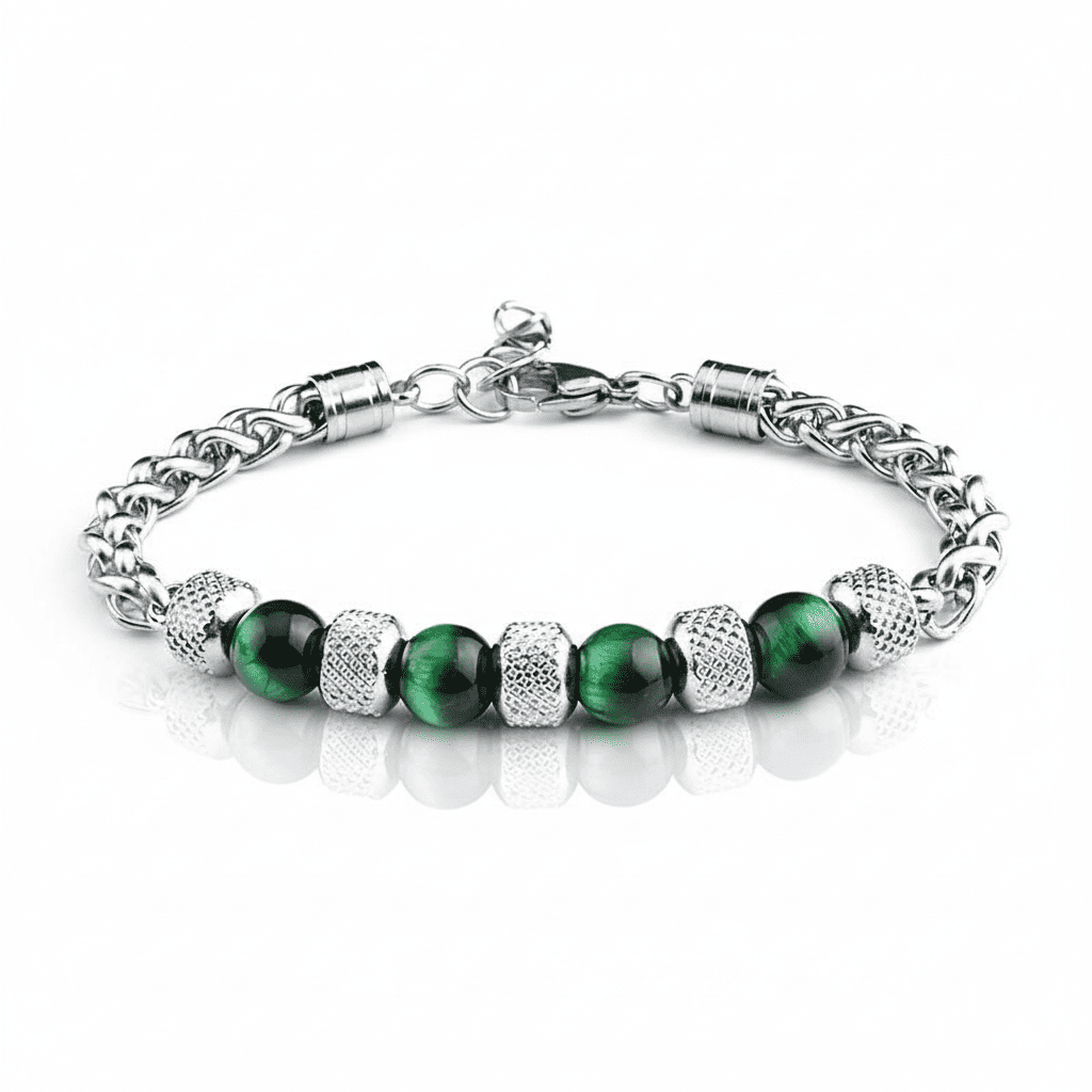 Yeşil Kaplan Gözü ve Çelik Bileşim Uzunluk Ayarlanabilir Avangart Erkek Bileklik
