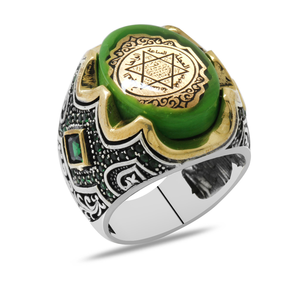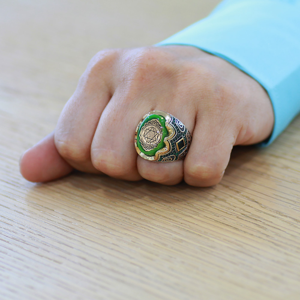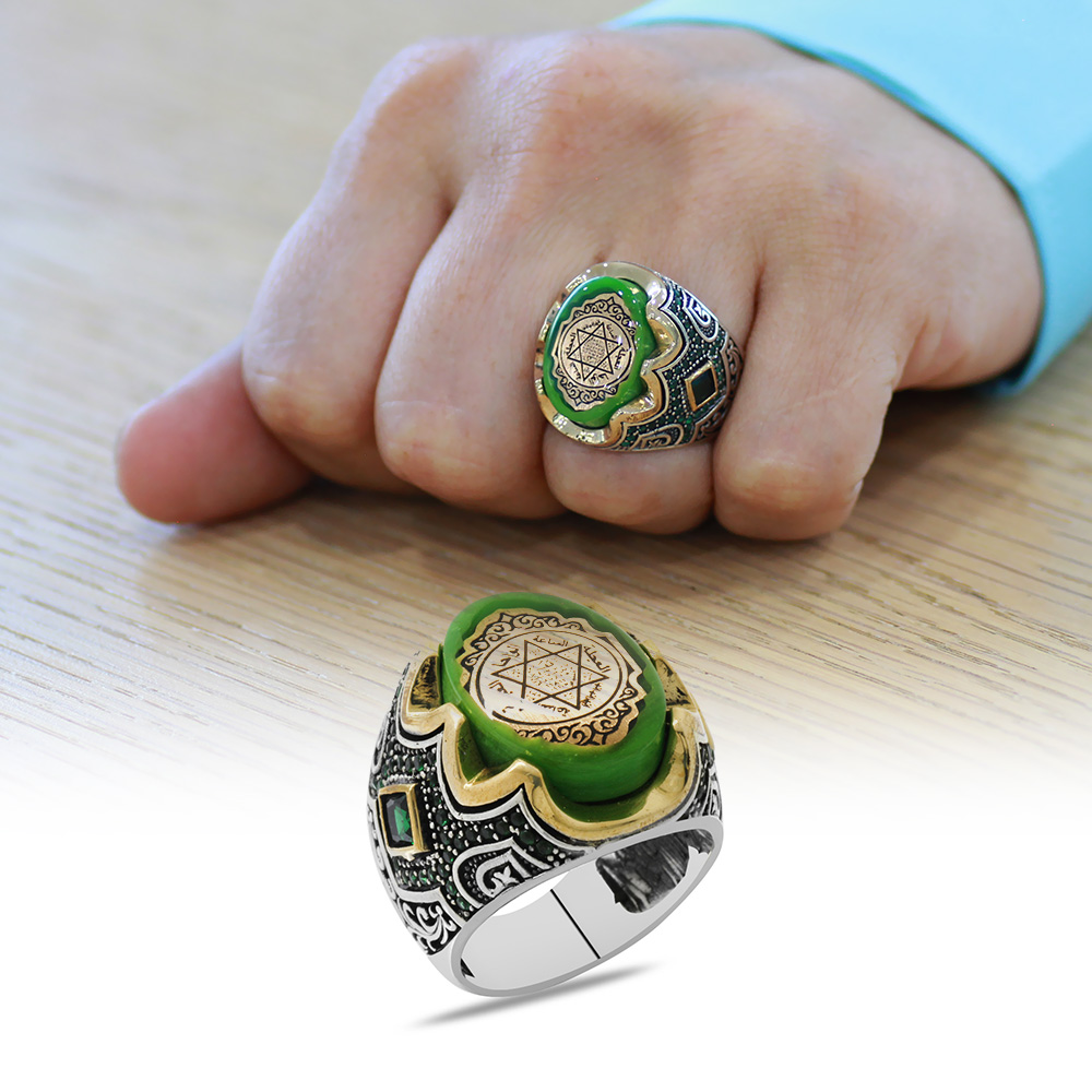 Yeşil Kehribar Üzerine Mührü Süleyman İşlemeli 925 Ayar Gümüş Erkek Yüzük