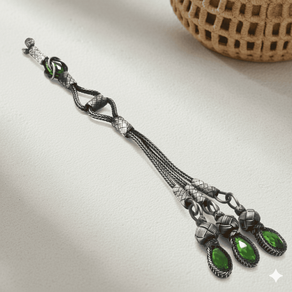 Yeşil Zirkon Taşlı 3 lü Uzun Model 1000 Ayar Gümüş Kazaz Püskül