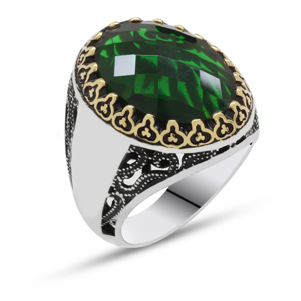 Yeşil Zirkon Taşlı Yanlara İsim Yazılabilir 925 Ayar Gümüş Erkek Yüzük