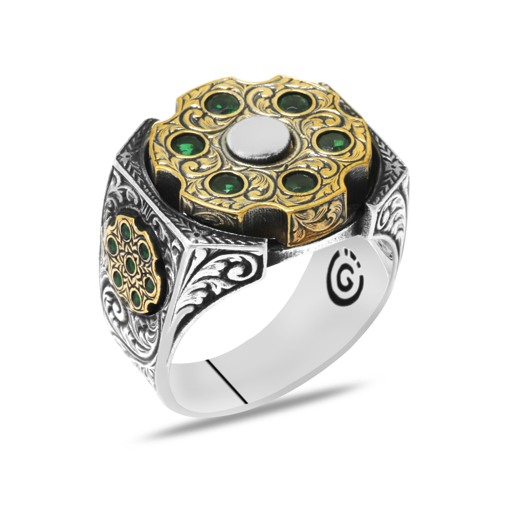 Yeşil Zirkon Taşlı Kalem İşçilikli Dönen Çark Tasarım 925 Ayar Gümüş Erkek Yüzük