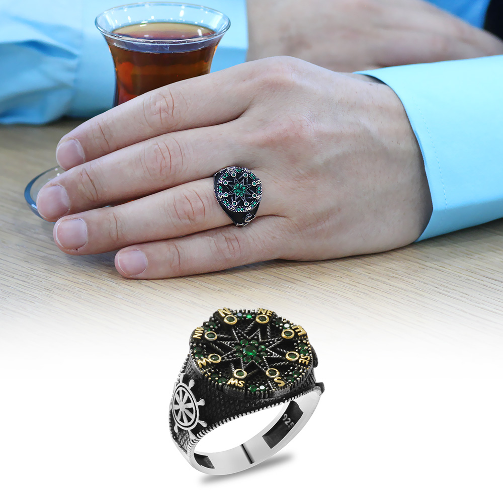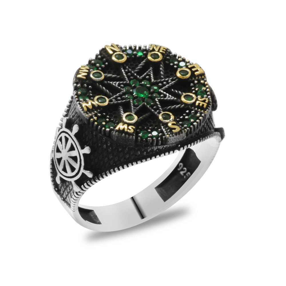 Yeşil Zirkon Taşlı Pusula Tasarım Yanları Çapa ve Gemi Dümeni Detaylı 925 Ayar Gümüş Erkek Yüzük