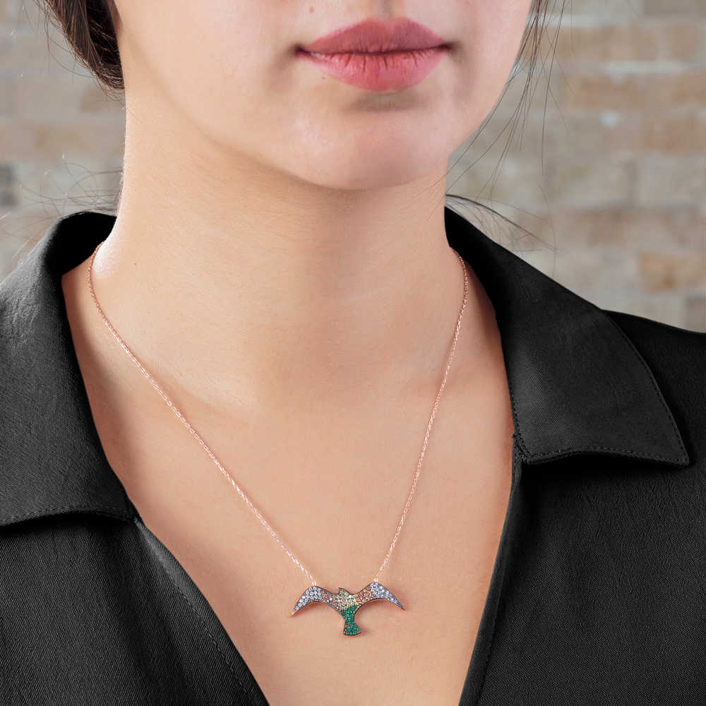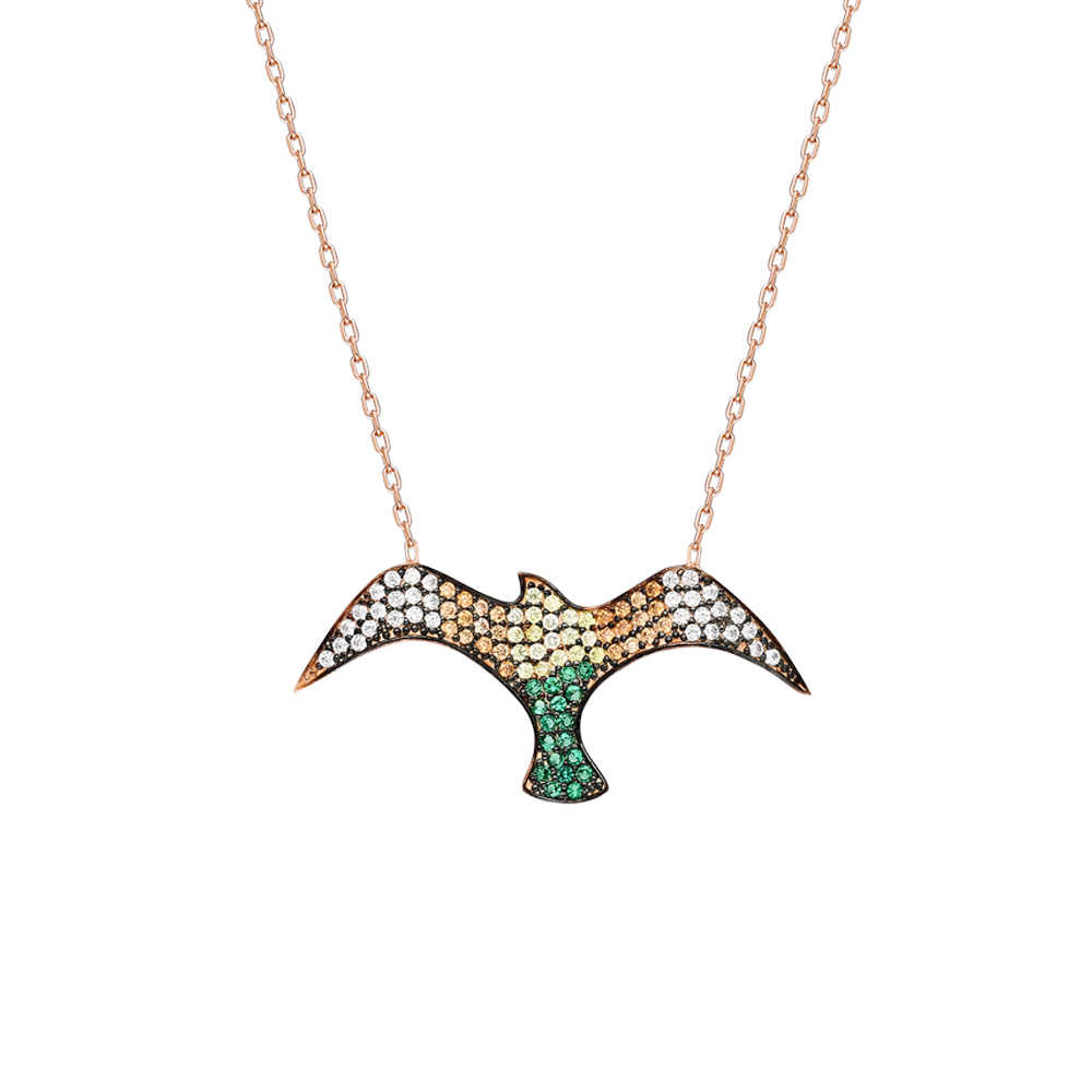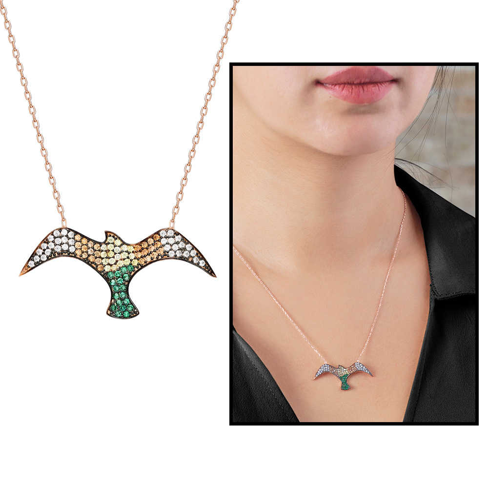 Yeşil ve Sarı Zirkon Taşlı Martı Tasarım 925 Ayar Gümüş Bayan Kolye