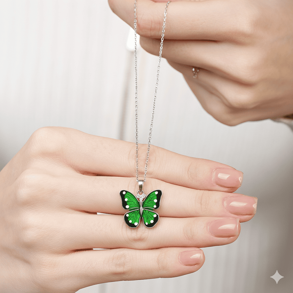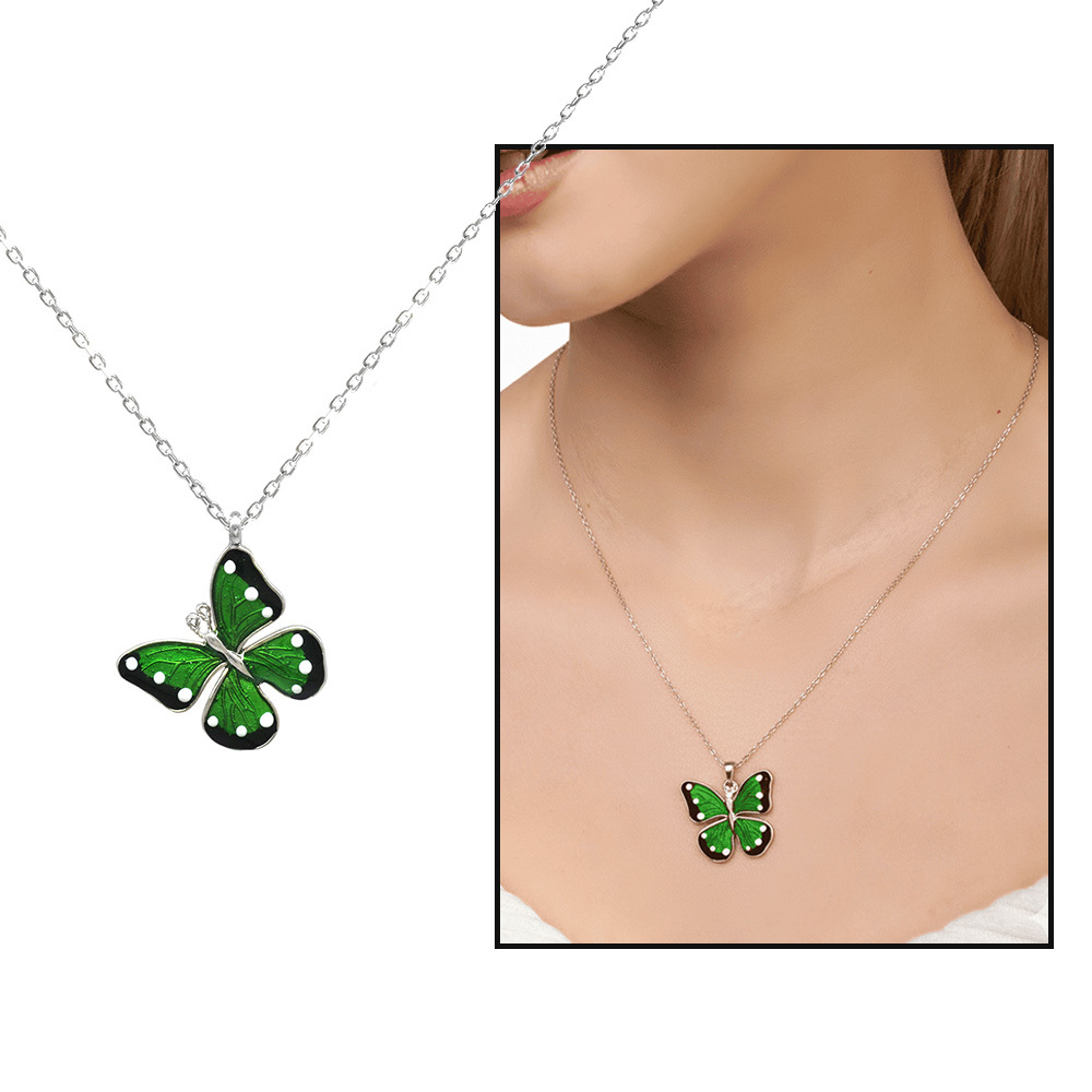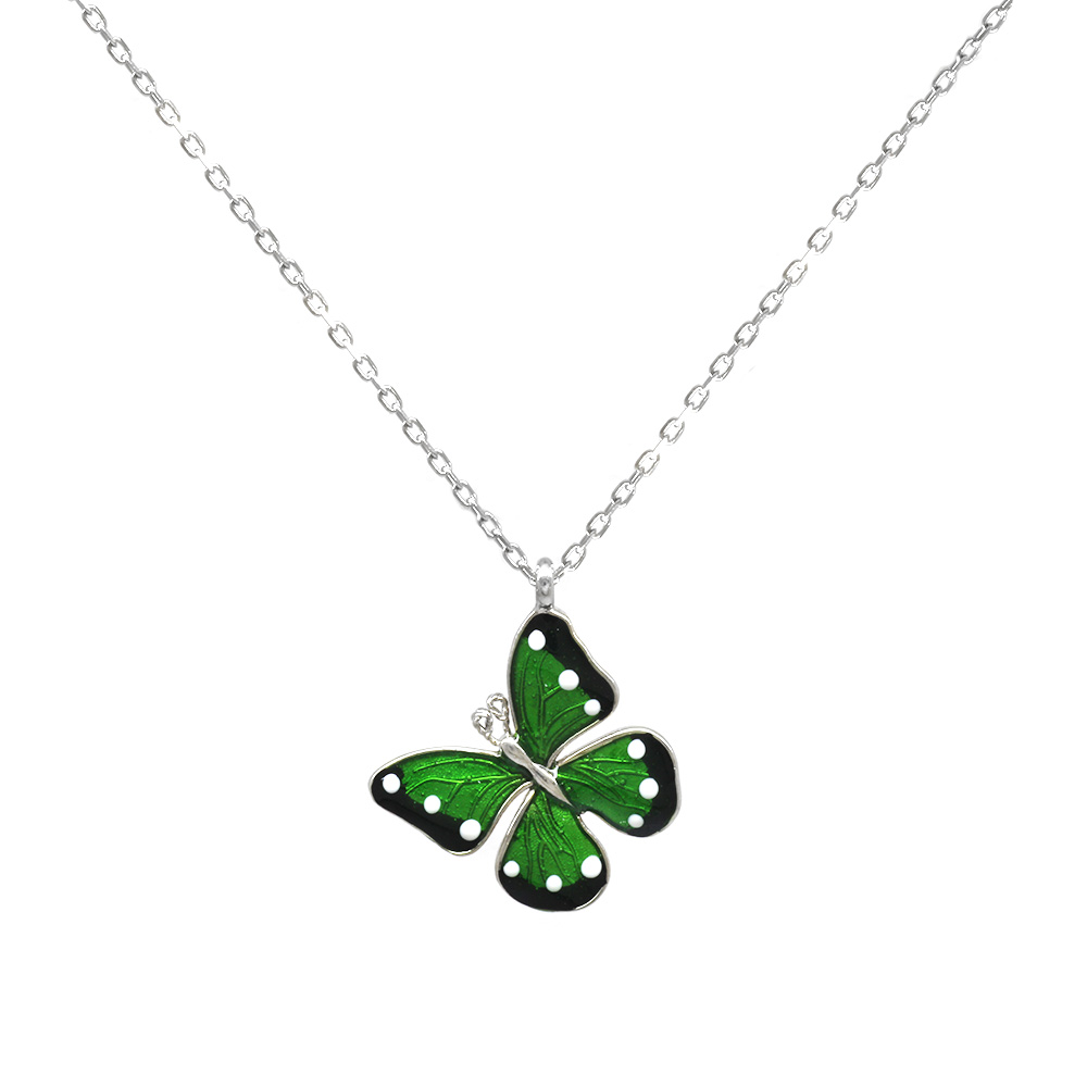 Yeşil ve Beyaz Mineli Kelebek Tasarım Gümüş Renk 925 Ayar Gümüş Kadın Kolye