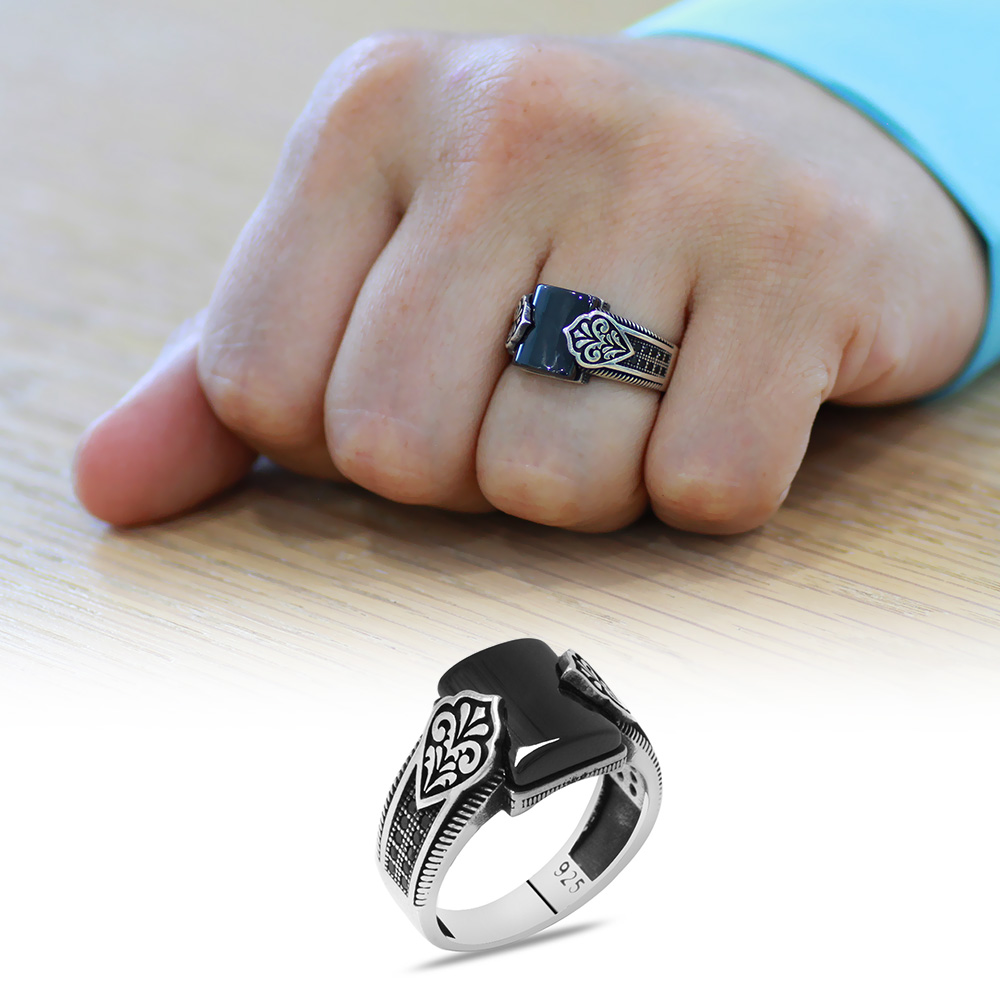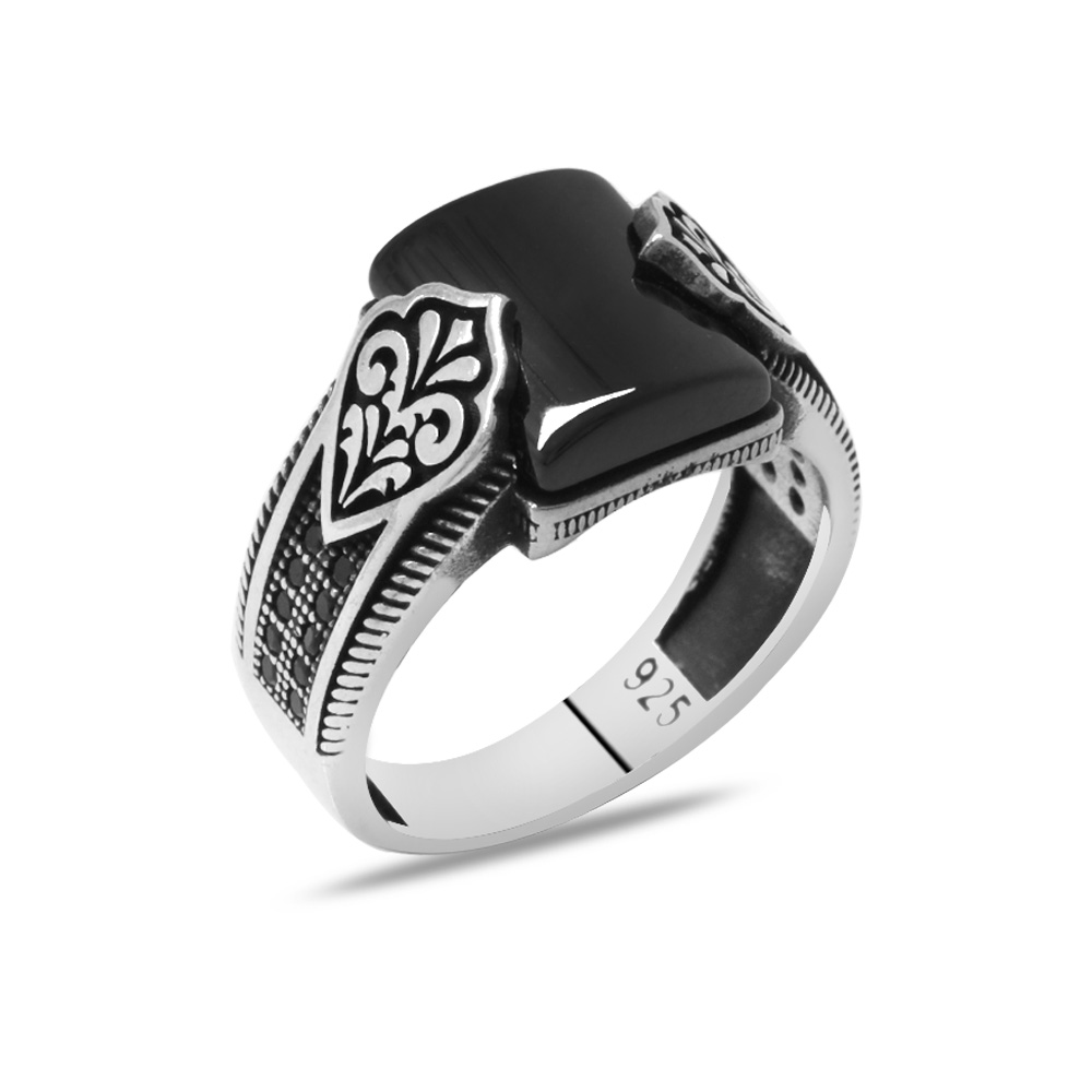 Zirkon Taş İşlemeli Basic Tasarım Bombeli Oniks Taşlı 925 Ayar Gümüş Erkek Yüzük