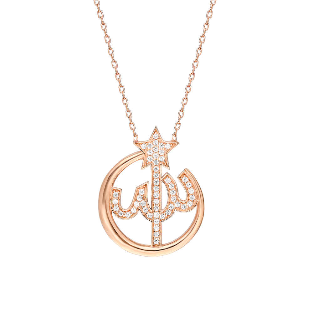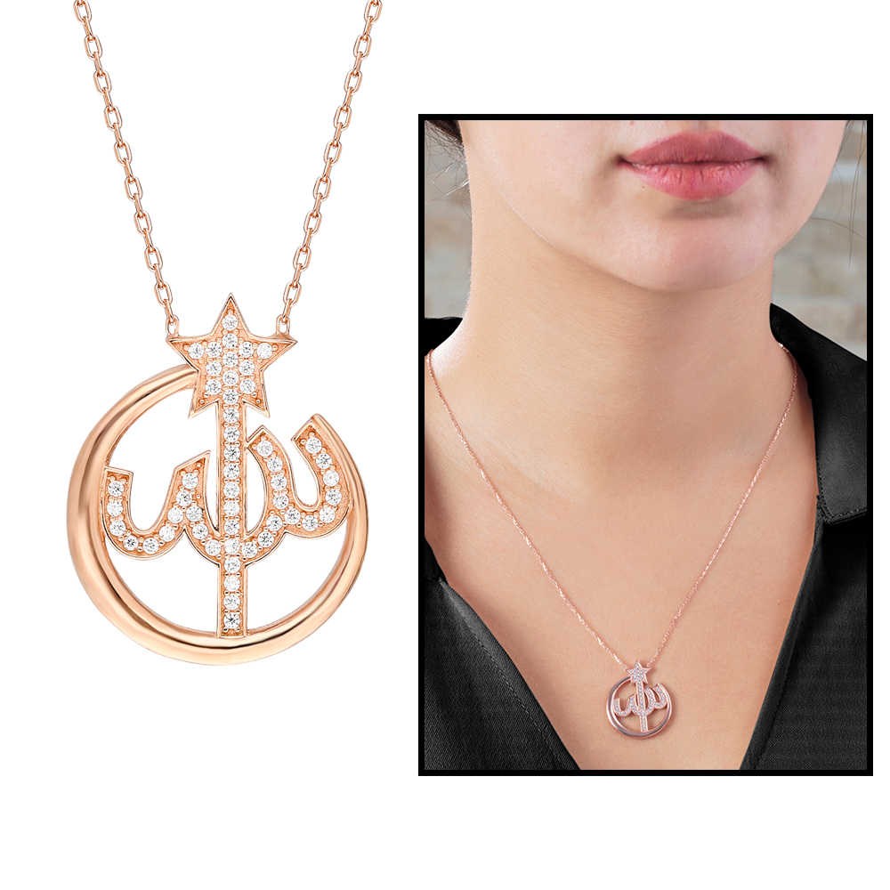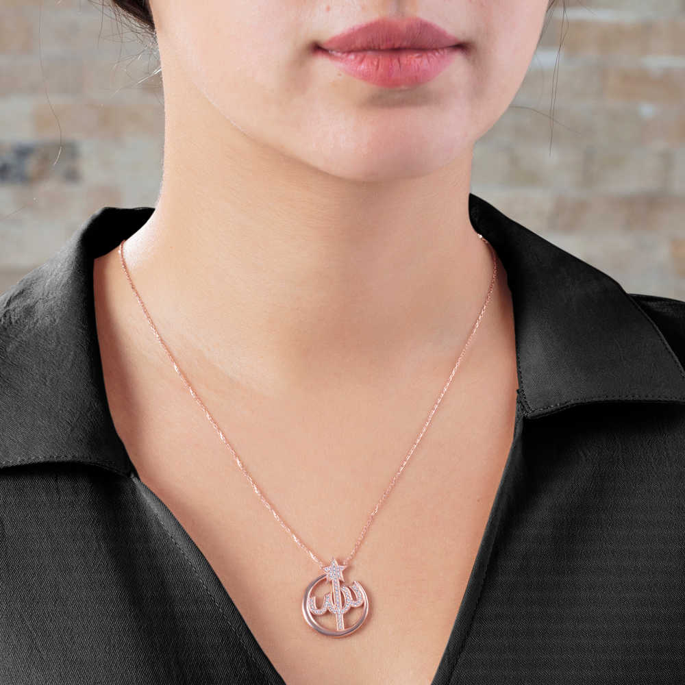 Zirkon Taşlı Arapça Allah Yazılı 925 Ayar Gümüş Bayan Kolye