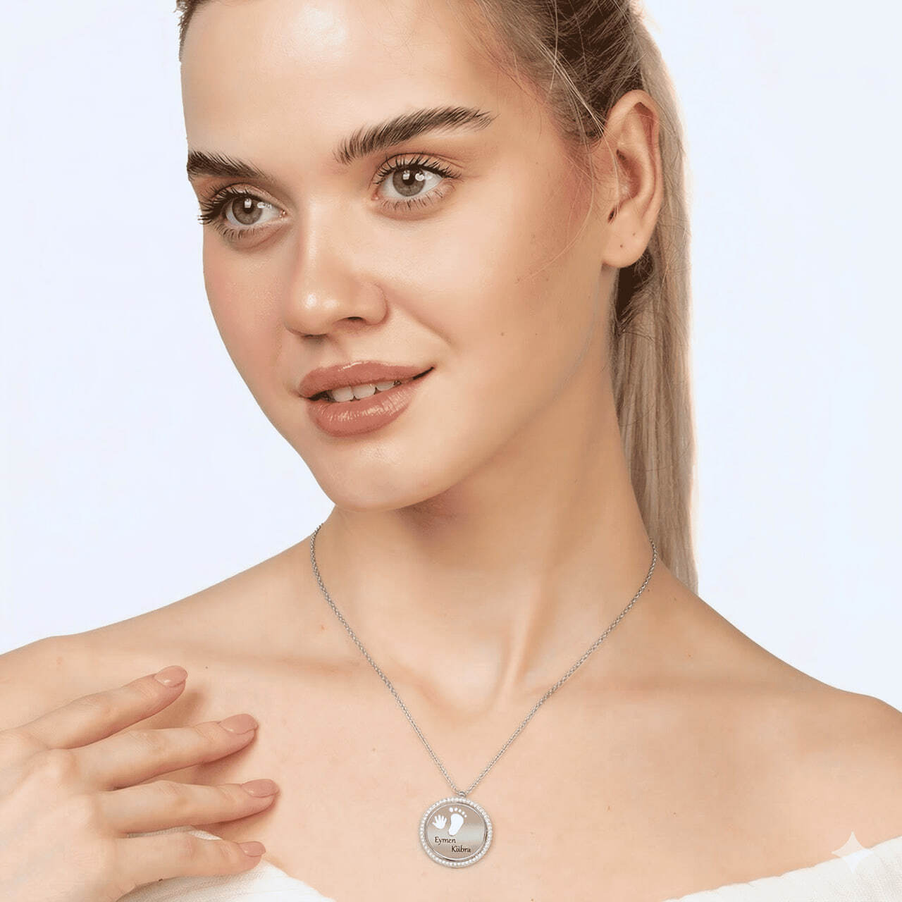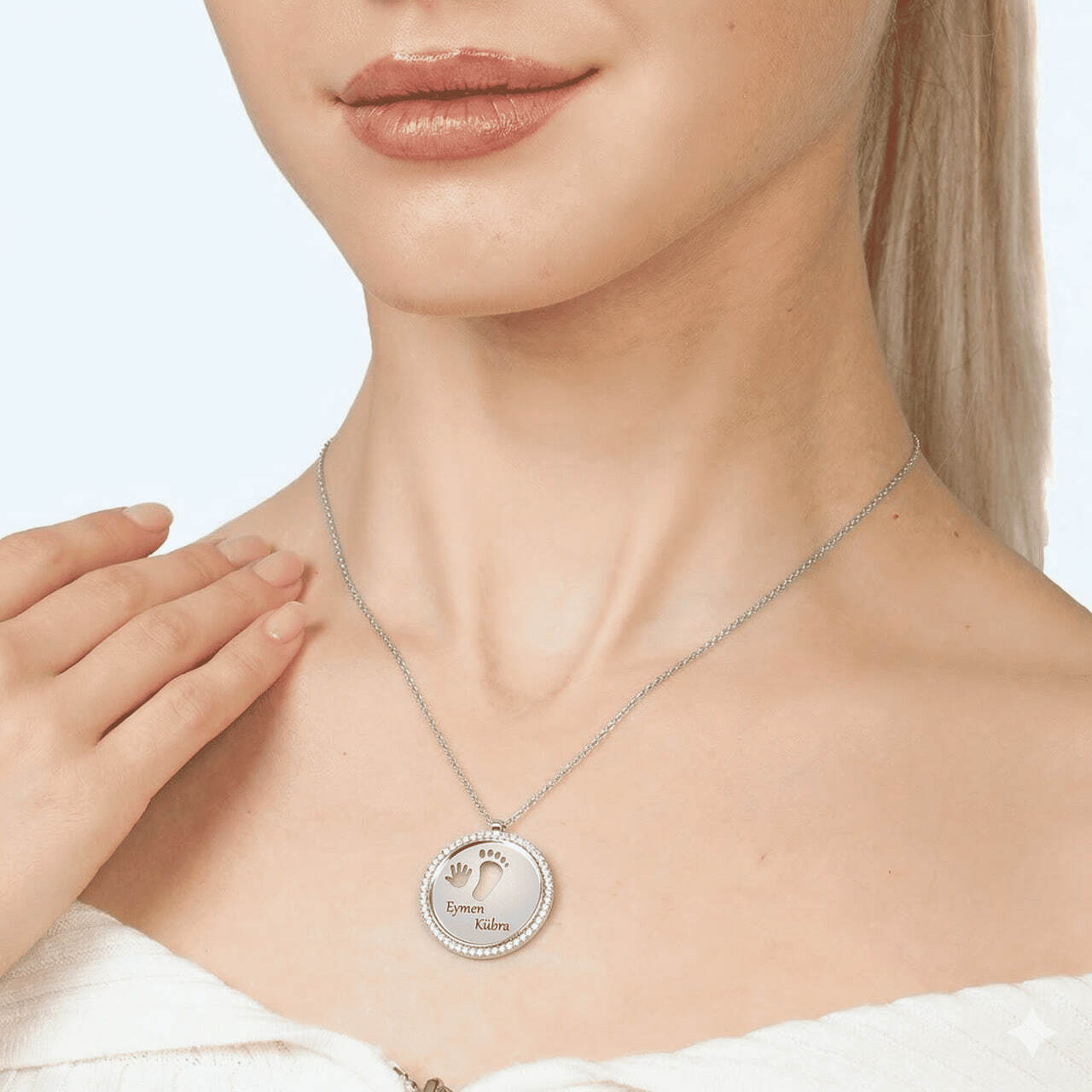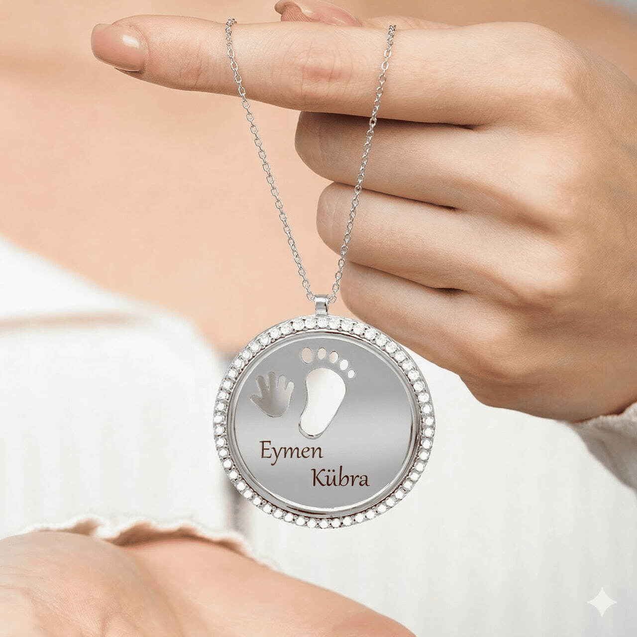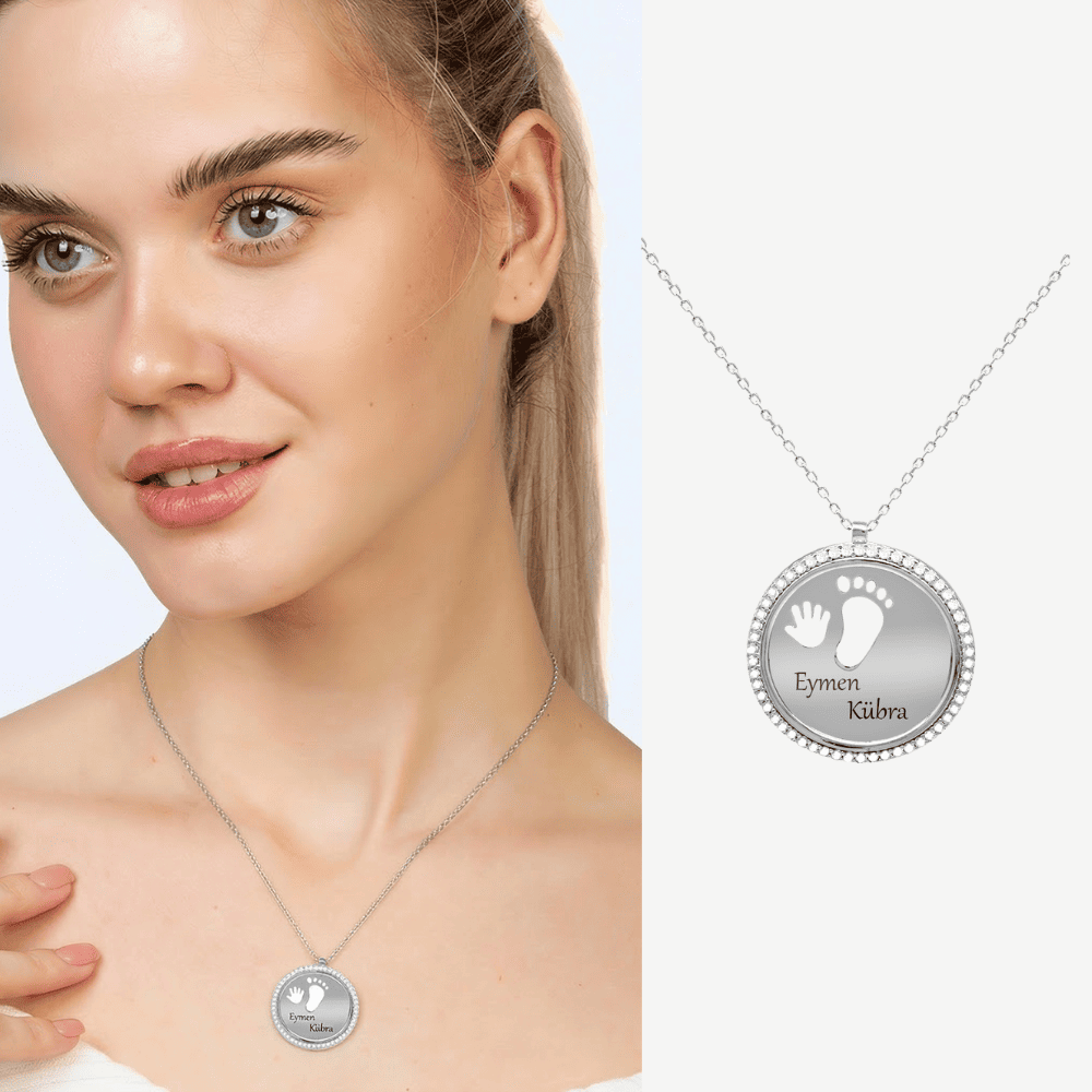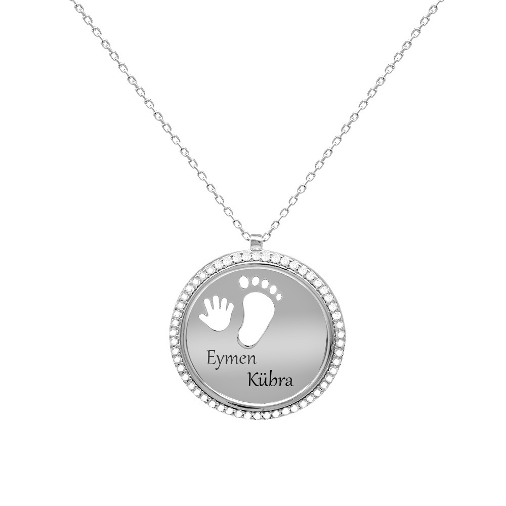 Zirkon Taşlı Bebek El ve Ayak Detaylı Gümüş Renk İsme Özel Harf Yazılı 925 Ayar Gümüş Kadın Kolye
