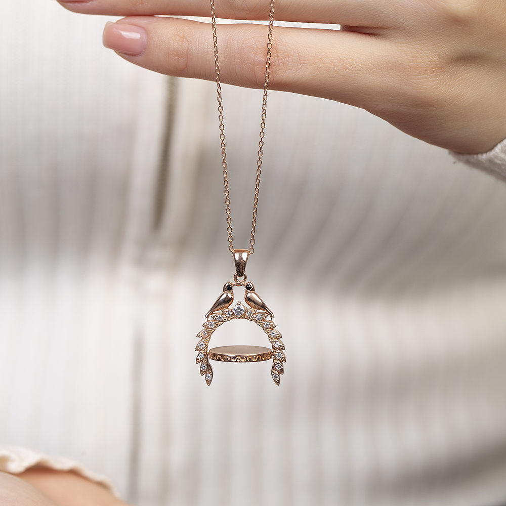 Zirkon Taşlı Çifte Kumrular Temalı İsme Özel Veya Harf Yazılı Rose Renk 925 Ayar Gümüş Kadın Kolye