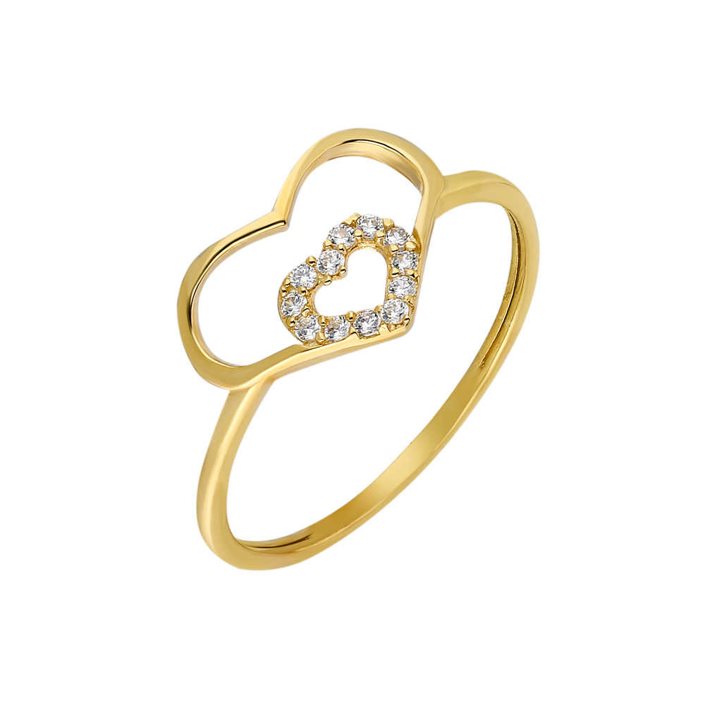 Zirkon Taşlı İç İçe Kalp Tasarım Altın Renk 925 Ayar Gümüş Bayan Yüzük