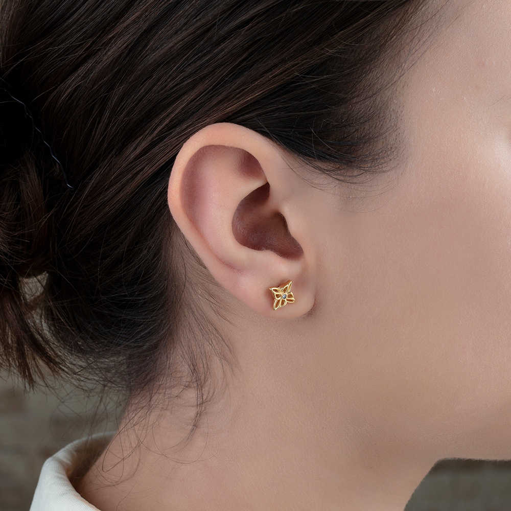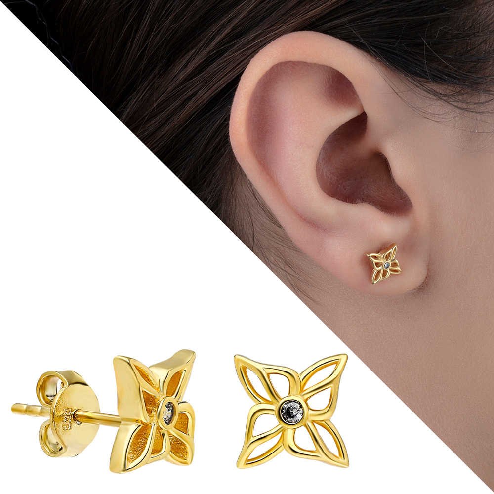 Zirkon Taşlı Ixora Çiçeği Tasarım Altın Renk 925 Ayar Gümüş Küpe - 1