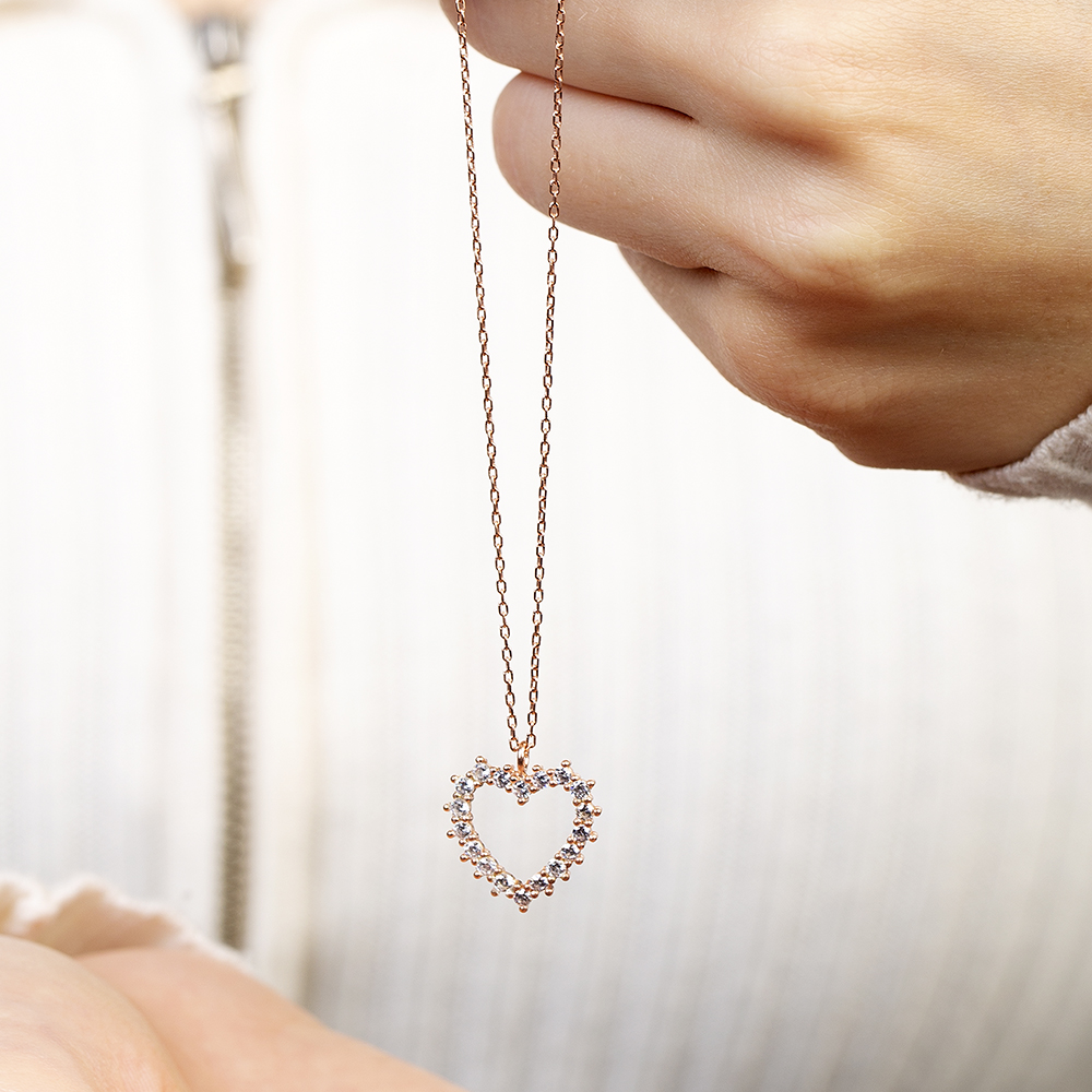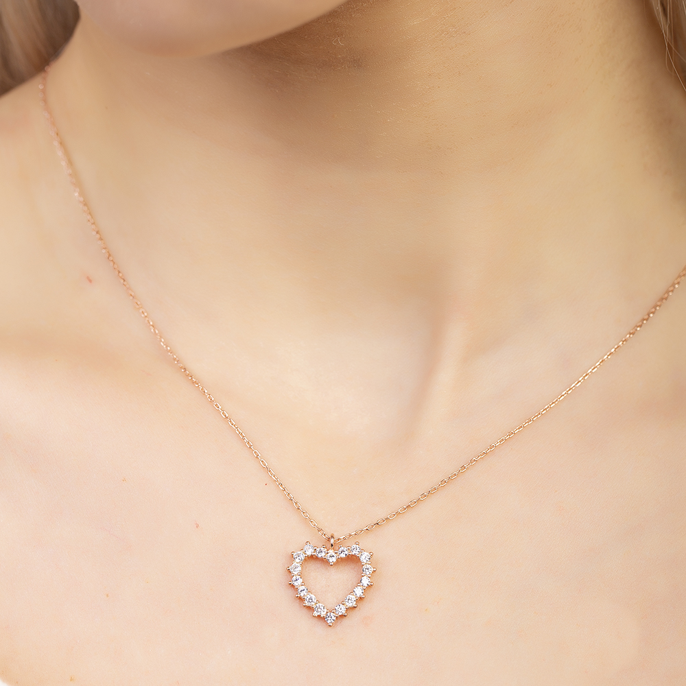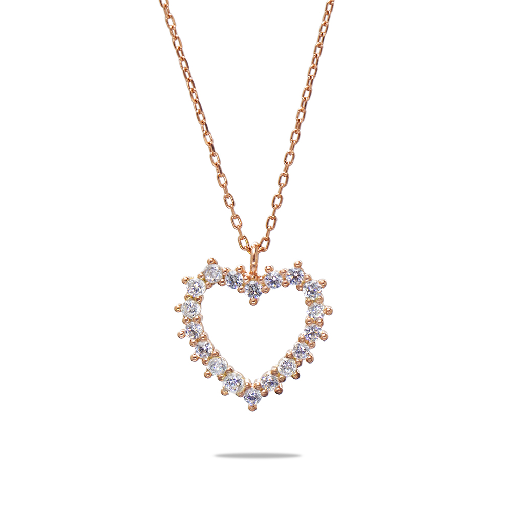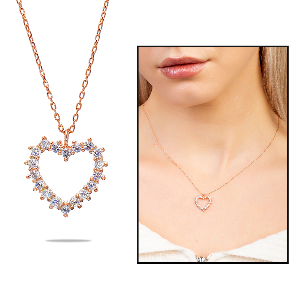 Zirkon Taşlı Kalp Tasarım Rose Renk 925 Ayar Gümüş Kadın Kolye