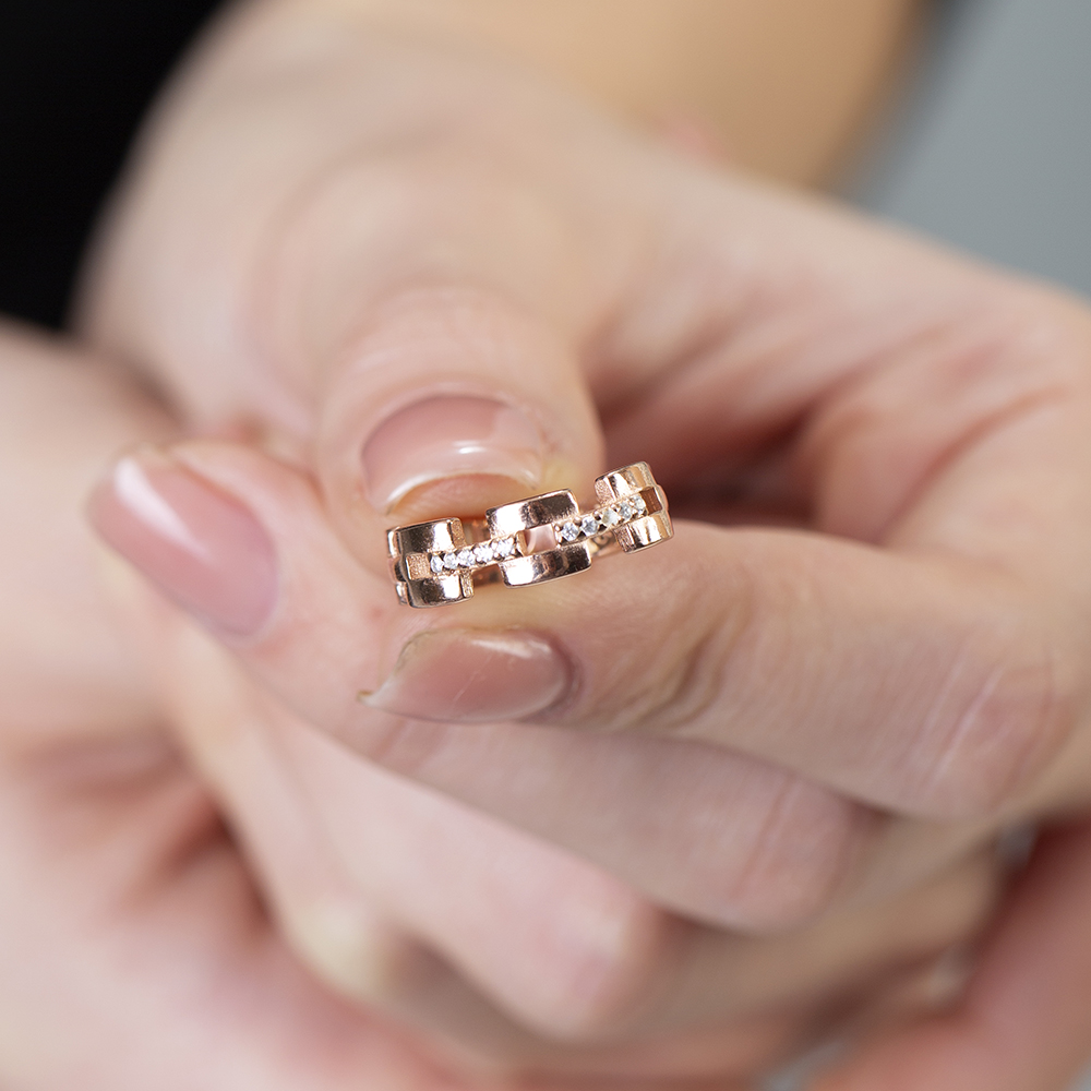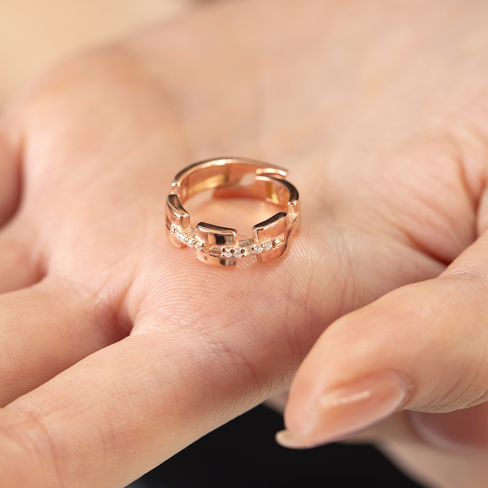 Zirkon Taşlı Kare Zincir Tasarım Rose Renk Ayarlanabilir Ölçü 925 Ayar Gümüş Kadın Yüzük