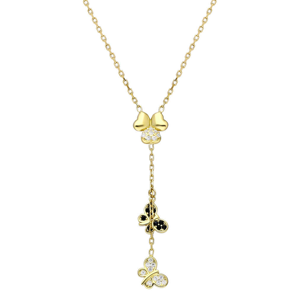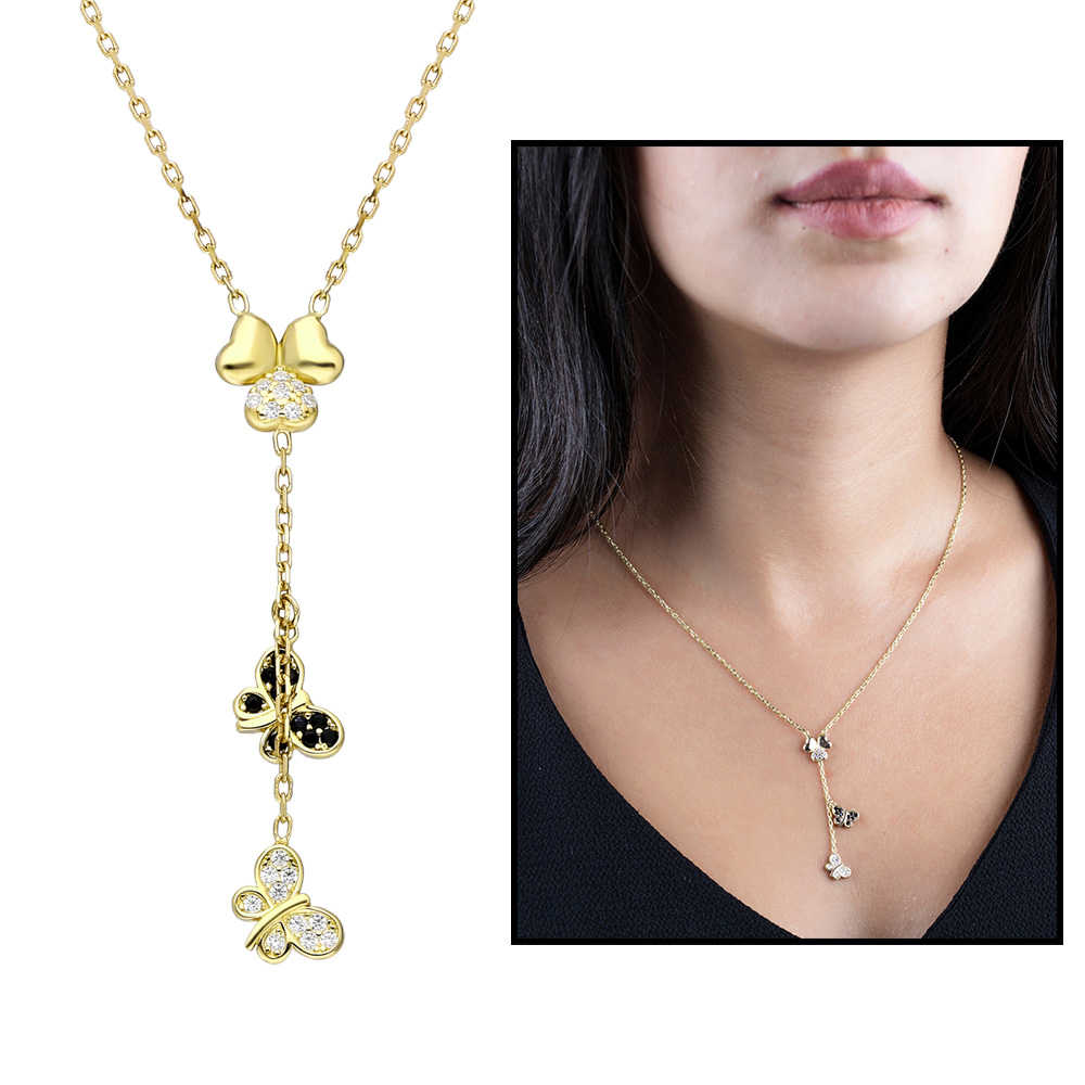 Zirkon Taşlı Kelebek Yonca Yaprağı Kombinli Altın Renk 925 Ayar Gümüş Kolye