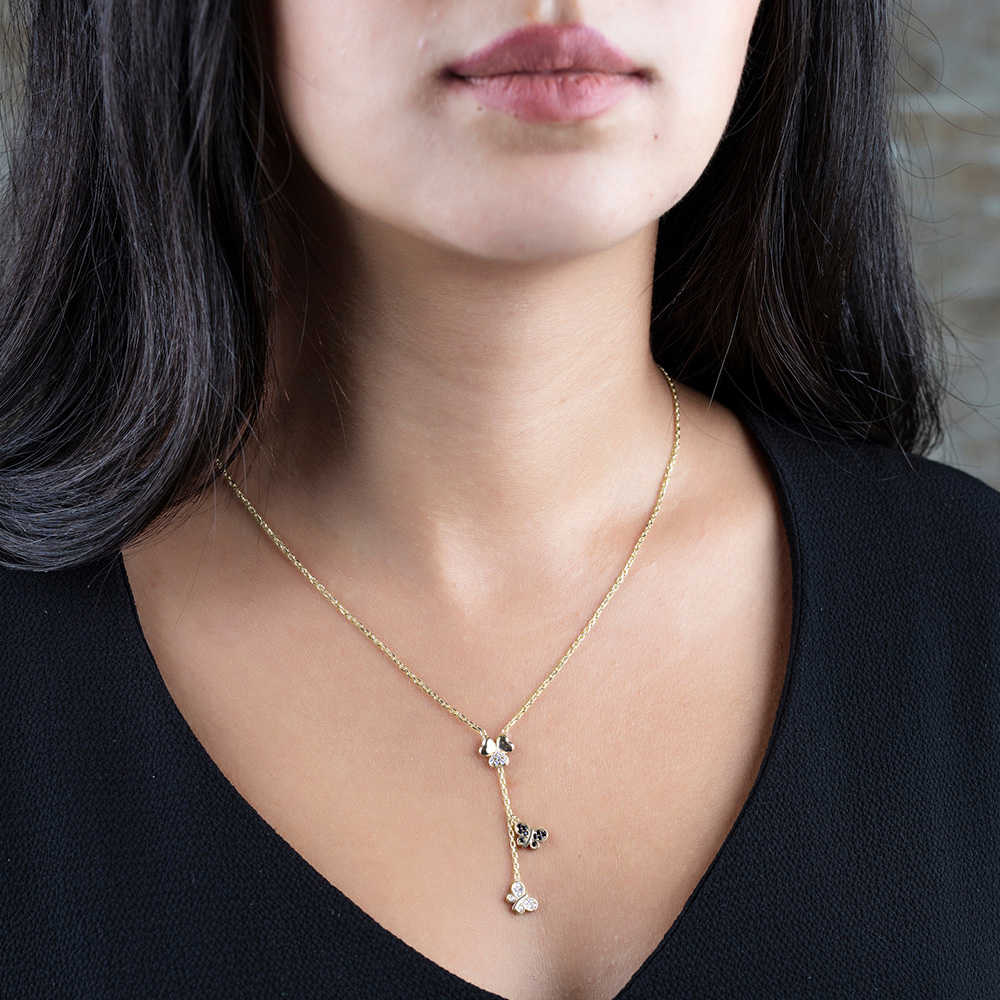 Zirkon Taşlı Kelebek Yonca Yaprağı Kombinli Altın Renk 925 Ayar Gümüş Kolye - 3