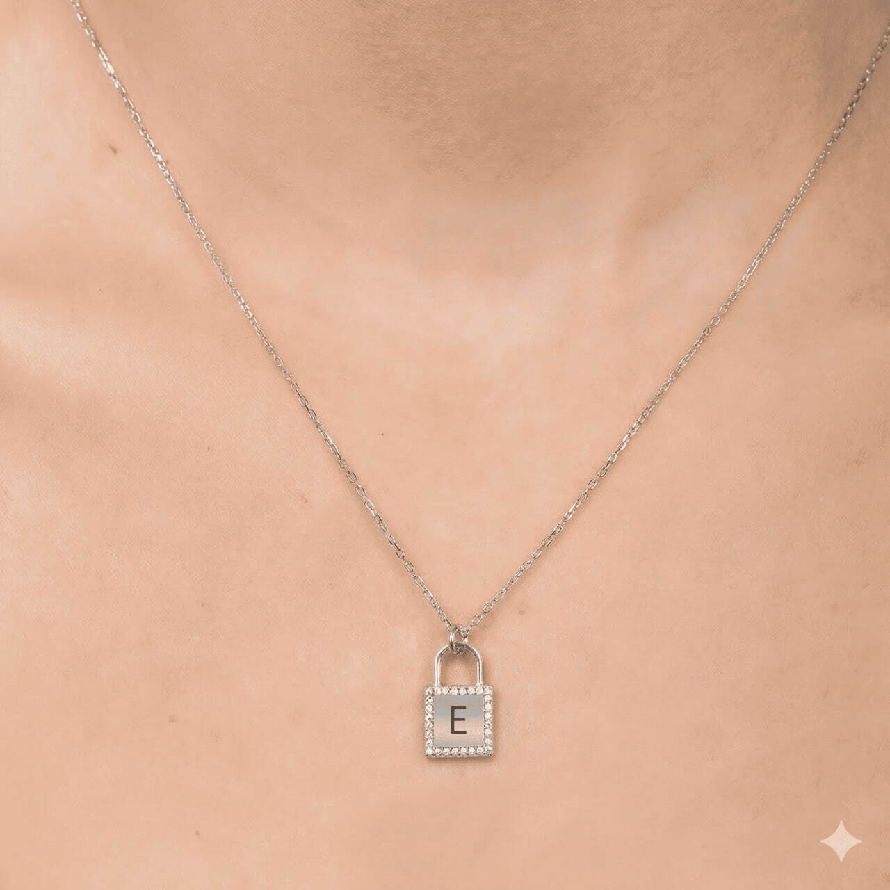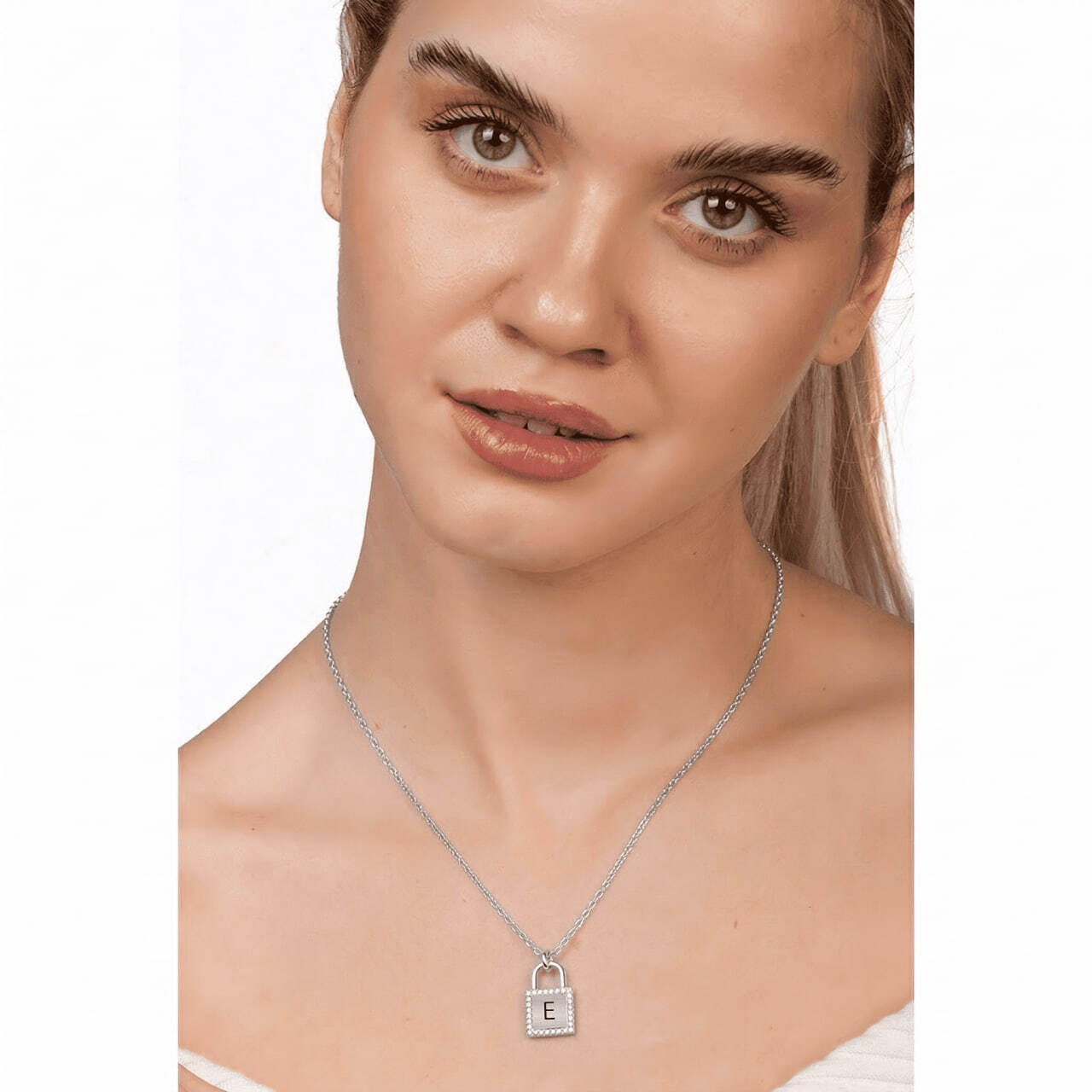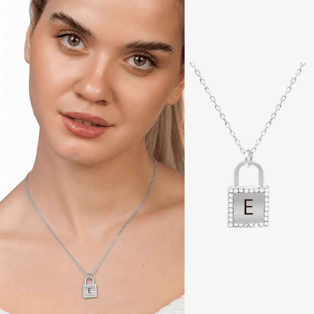 Zirkon Taşlı Kilit Tasarım Gümüş Renk İsme Özel Harf Yazılı 925 Ayar Gümüş Kadın Kolye