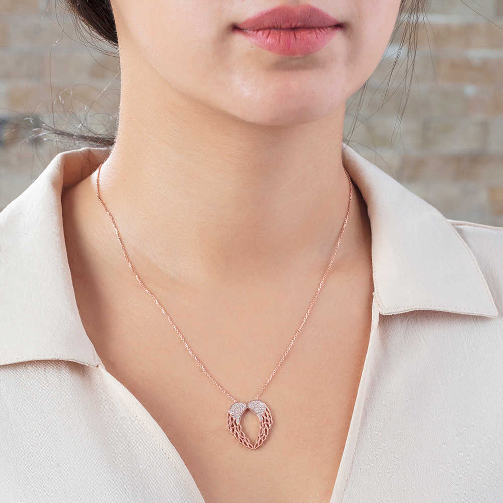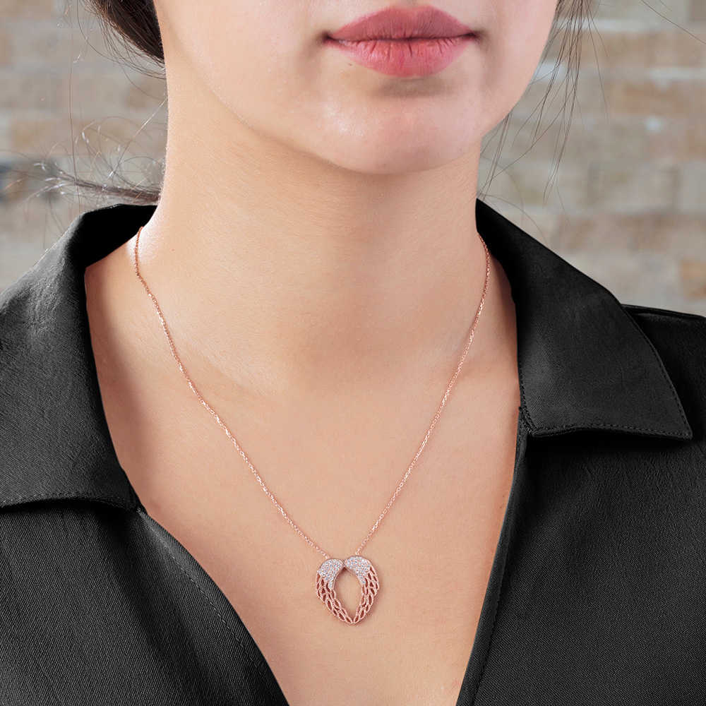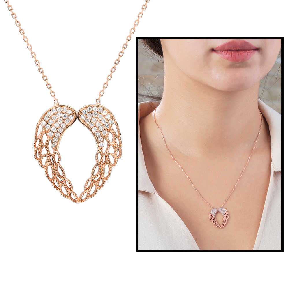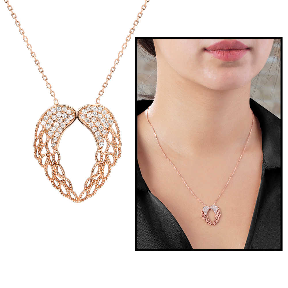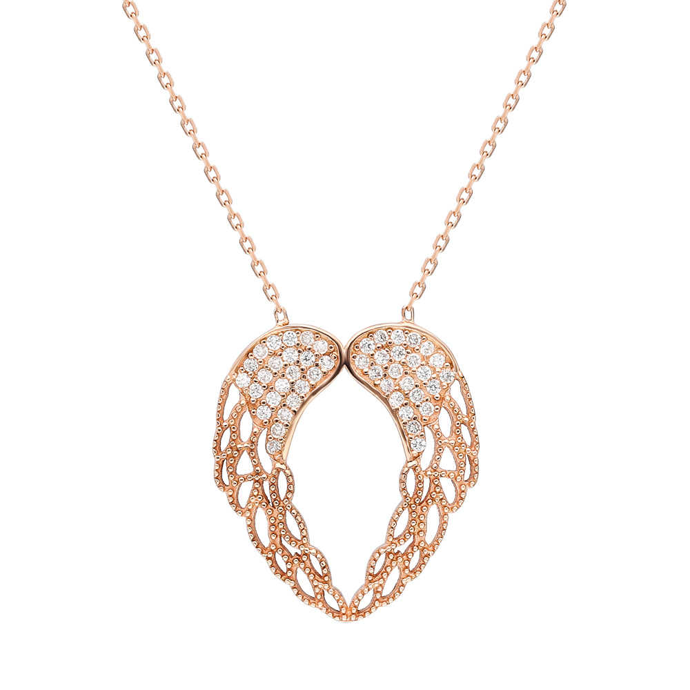 Zirkon Taşlı Melek Kanadı Tasarım Altın Renk 925 Ayar Gümüş Kolye