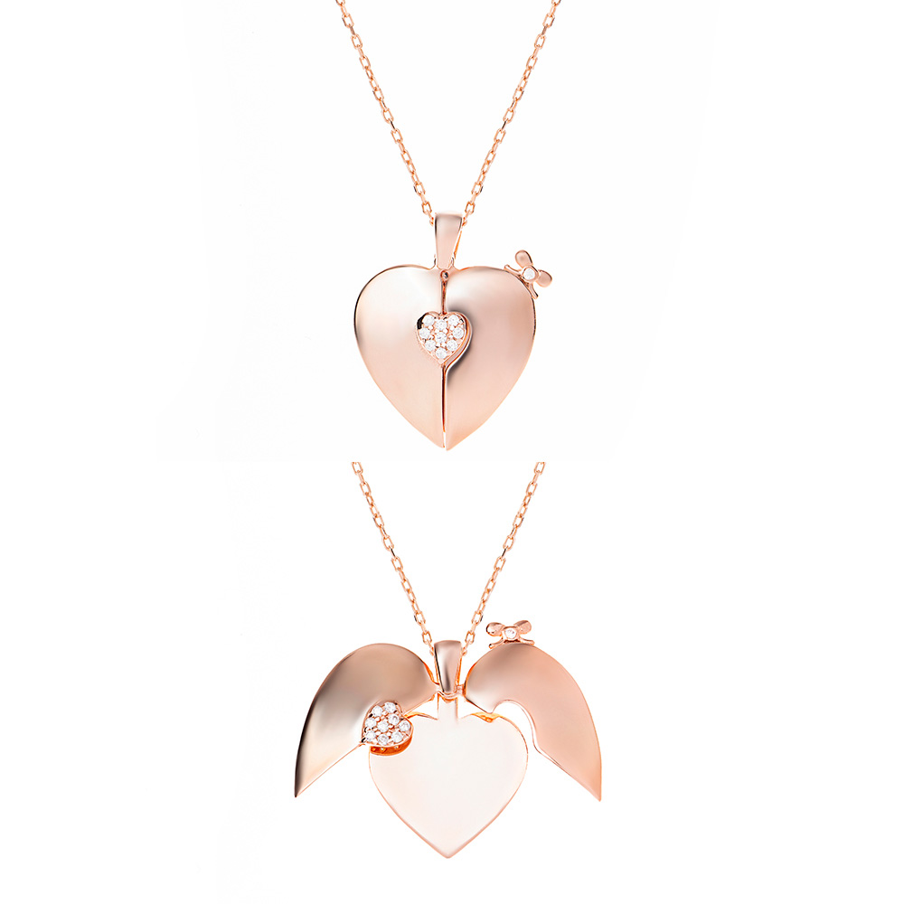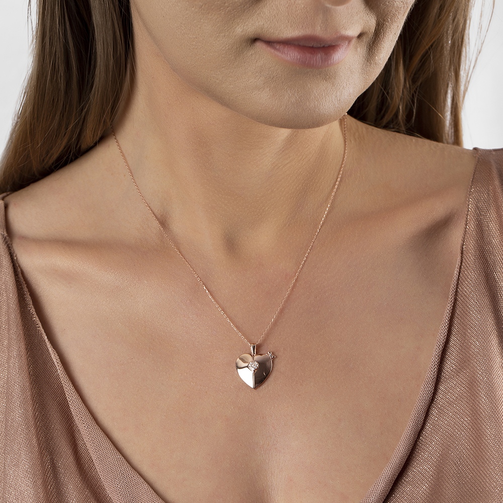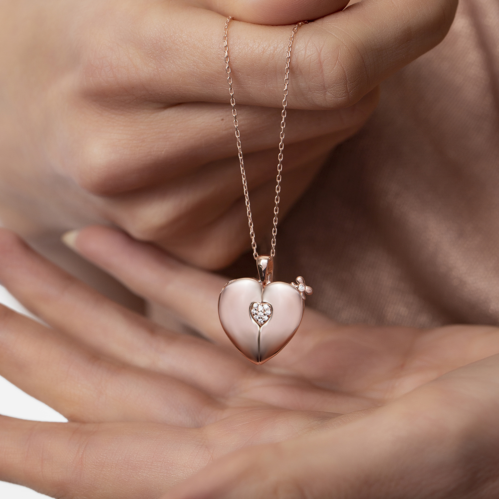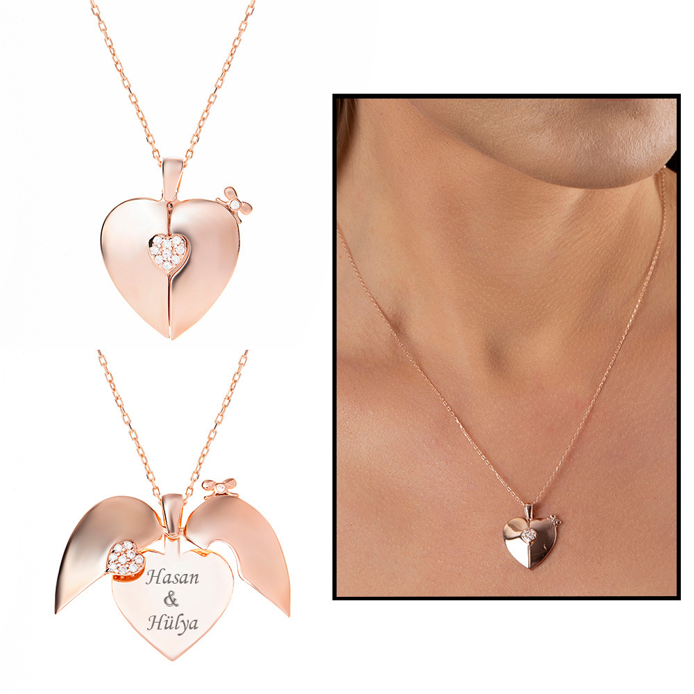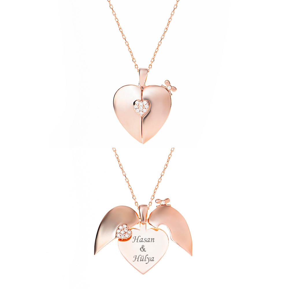 Zirkon Taşlı Rose Renk İsme Özel Yazılı 925 Ayar Gümüş Kalp Kolye