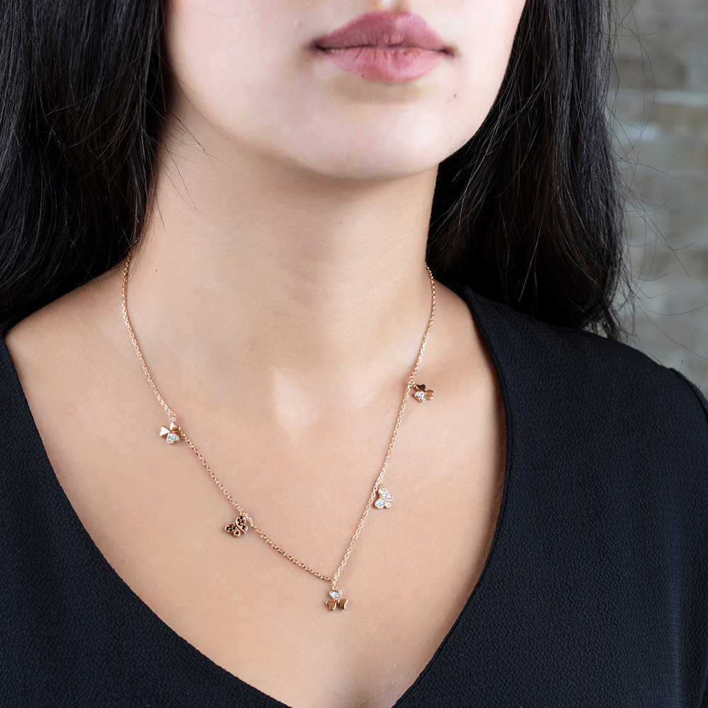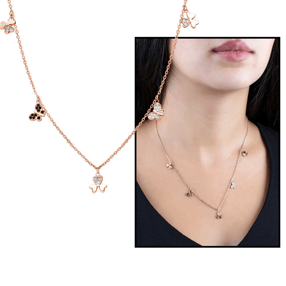 Zirkon Taşlı Yonca Yaprağı Kelebek Kombinli Rose Renk 925 Ayar Gümüş Şans Kolyesi - 1