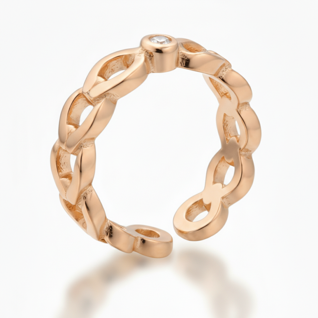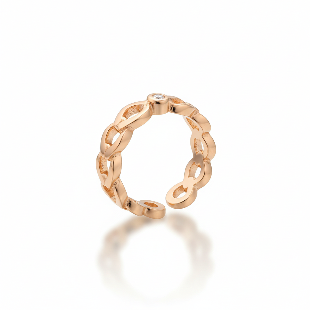 Zirkon Taşlı Zincir Tasarım Rose Renk Ayarlanabilir Ölçü 925 Ayar Gümüş Kadın Tektaş Yüzük